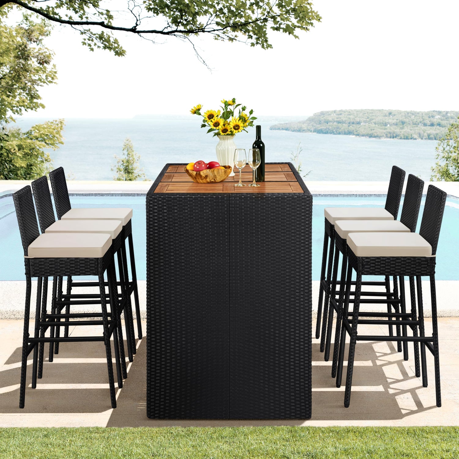 Yaheetech 7 Piece Patio Dining Set Outdoor Acacia Wood Bar Table and Chairs with Removable Cushions, Wicker Furniture Set for Deck, Backyard, Garden, Black/Beige