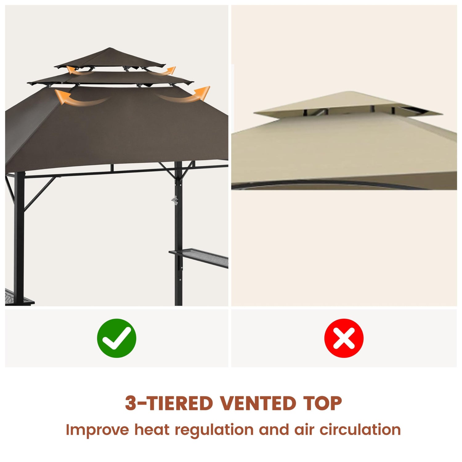 - 【Improved Ventilation With 3-tiered Top】Boasting a 3-tiered vented top, this grill gazebo tent optimizes heat dissipation when grilling, enhances airflow, and also improves the overall wind resistance.