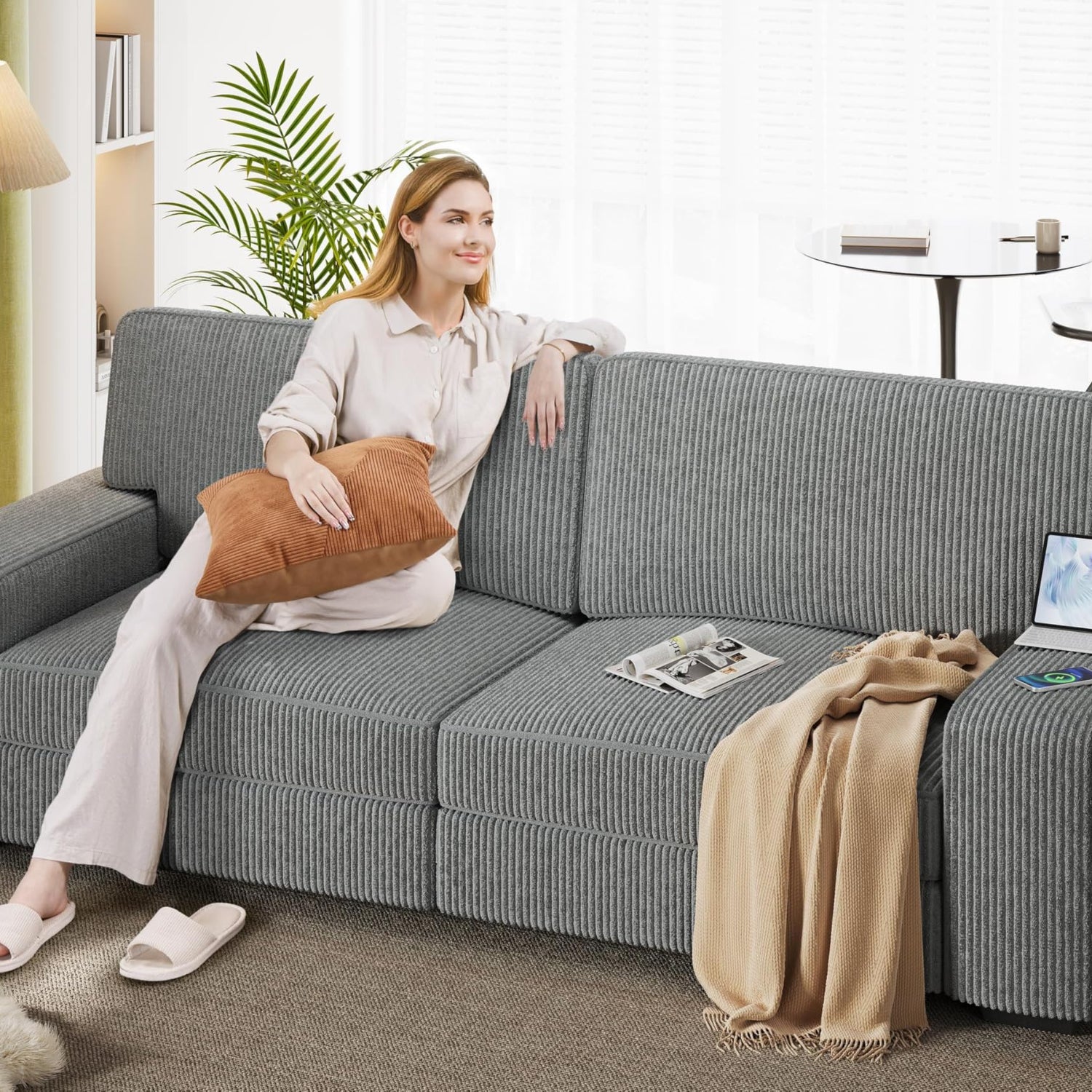 - Quality and Soft: The living room couch is covered in corduroy-like fabric with raised fabric channels for excellent softness and comfort. The low-slung seat is supported by 6 robust trapezoid legs and can support up to 272kg/600lbs. Its skin-friendly texture and robust structure optimize the sitting and lounging experience