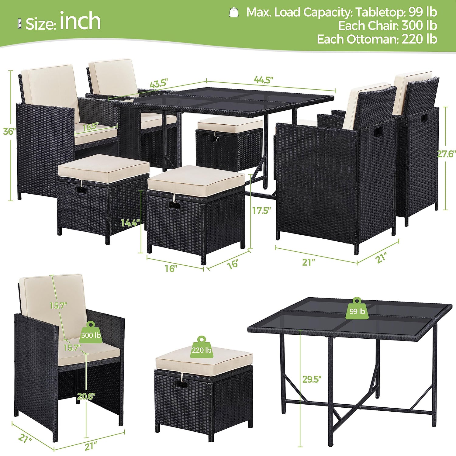 - 【Sturdy Construction】This table and chair set is built to last with PE rattan and reinforced metal frame. The table is designed with a water-resistant tempered glass top and steel support. The maximum load-bearing capacity of each chair is 300lb, while each ottoman is 220lb.