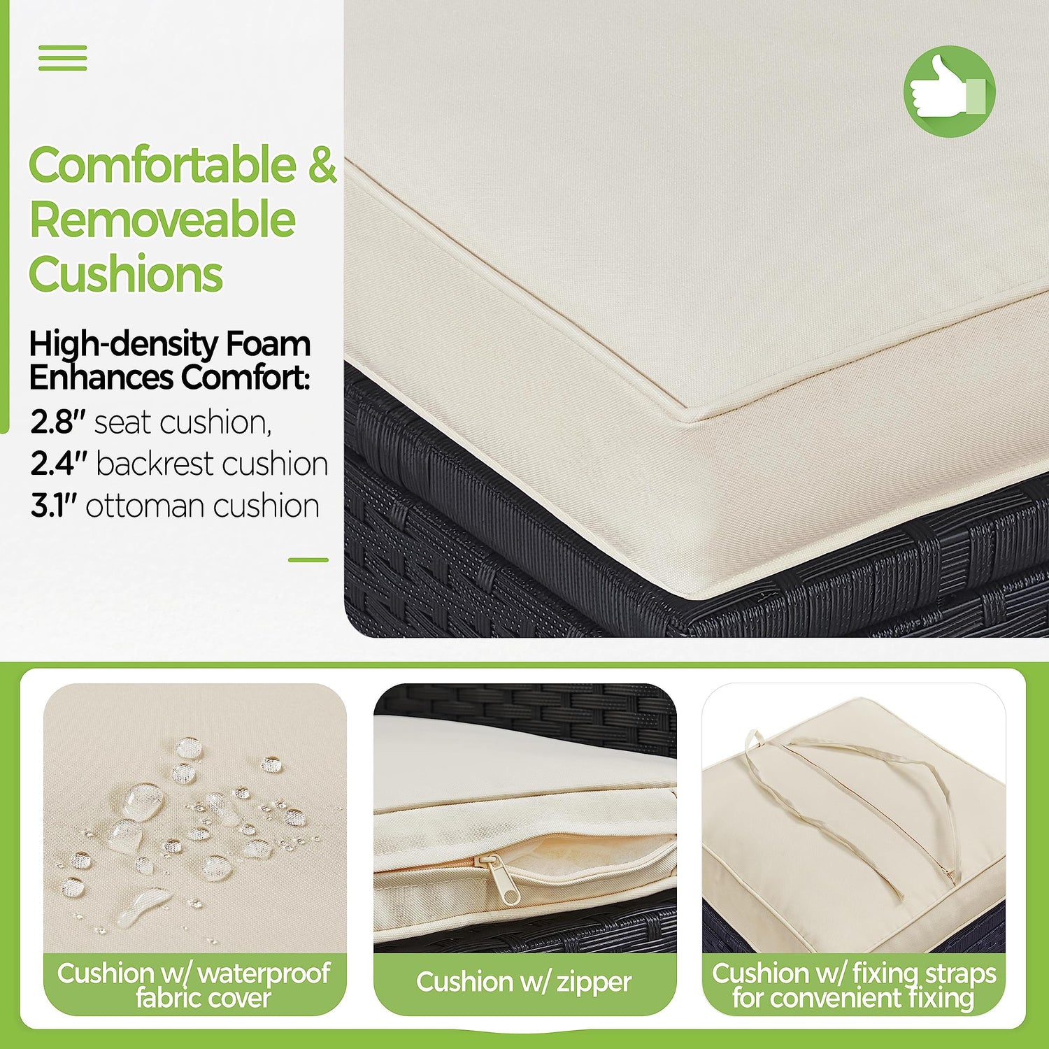 - 【Comfortable & Removeable Cushions】Padded with a high-resilience foam, this table set with good elasticity is very soft to provide you with a comfortable seating experience. The waterproof cover of the cushions with zippers can be easily removed, which facilitates your cleaning and maintenance.