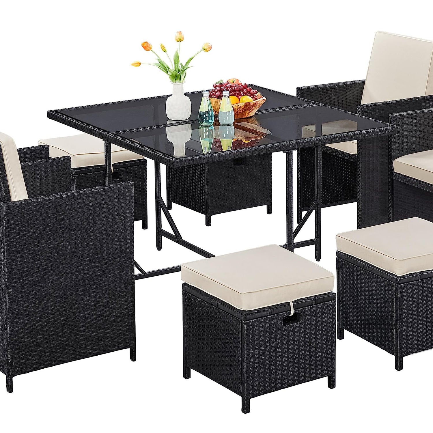 Yaheetech 9-Piece Patio Dining Sets Outdoor Space Saving Rattan Chairs with Glass Table, Wicker Patio Furniture Sets Outdoor Sectional Conversation Set with Removeable Cushions, Black