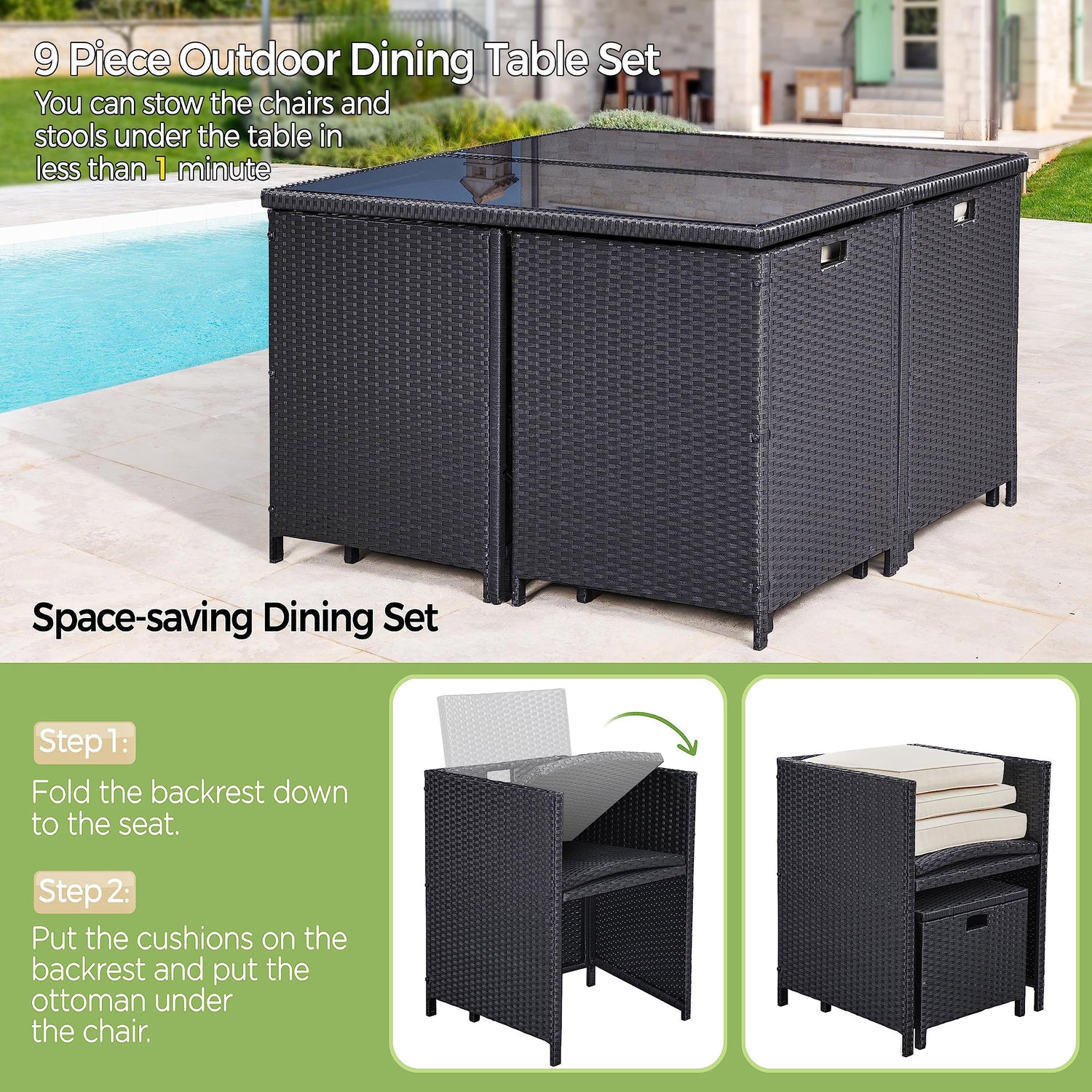 - 【Space-saving Furniture Set】All chairs and ottomans can completely tuck under the table when not in use. Each chair has an ottoman that can be conveniently stored underneath the seat. The reclining chairs can be stackable with foldable backrests and removable cushions as well.