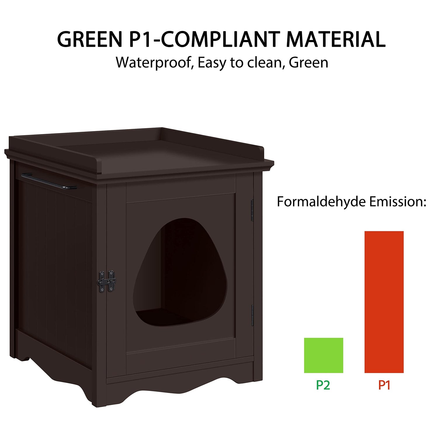 Looking for a quick and easy solution to hide your catâs litter loo while maximizing space in small apartments without sacrificing style? You donât want to miss this Cat Litter Box Cabinet. This versatile and innovative furniture not only hides the ugly cat litter box but also offers decent storage or display surface on the top. Constructed of quality MDF and with an interior of L40cmxW50cmxH44.6cm/ L15.7âxW19.6âxH17.6â, it can accommodate most litter boxes for small/medium-sized cats. This cat litter box furniture features several pet-parent-friendly designs like the side towel bar, 7 vent holes on the back, a magnetic door catch and door latch and 4 non-slip rubber pads. Simple assembly is required.