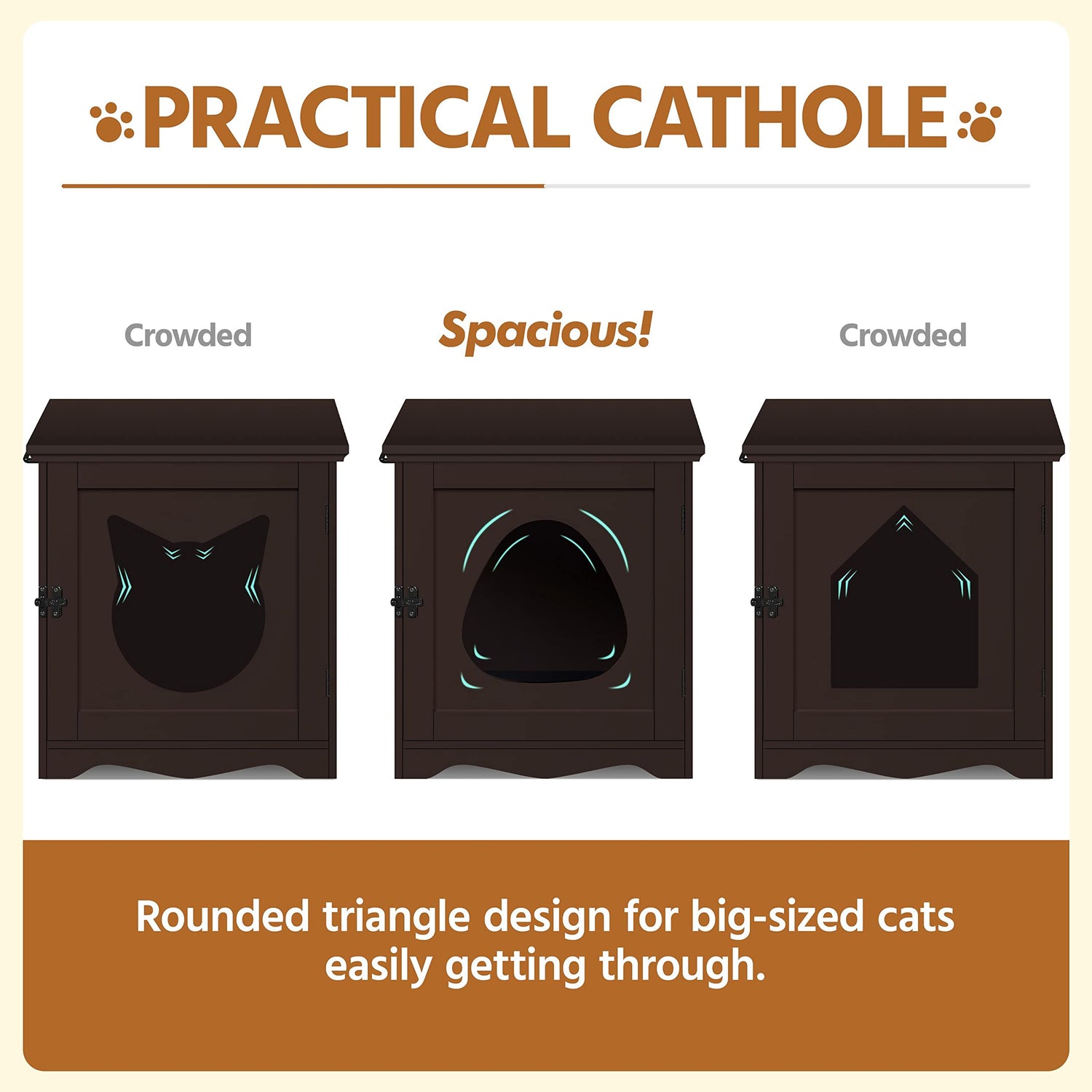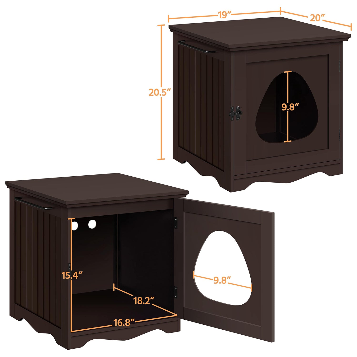 Details: Enclosed Litter Box Decorative Cat House Cat Washroom Pet Side Table Indoor Pet Crate Cat Litter Box EnclosuresQuick overview:If you want a smart and attractive way to conceal a catâs litter box, this enclosed cat litter box table will be the best choice. Not only hide the litter box inside and also match other home furniture, fitting most litter boxes. This table serves well as a side table, a decorative cat litter box, or a pet house. The tabletop can be a good place for your lovely ornaments or can be a small platform for your pet to rest on. Plus, there is a cat hole on the door panel, easy access for a cat going in and out. Catâs head sticks out of the hole when he/she poops, so adorable, isnât it? Donât keep your cute cat waiting! Take this piece of worthy and versatile furniture home now.Specifications:Material: MDF and paintingColor: EspressoOverall size: 19x20x20.5in (LxWxH); interior size: 17x18.2x15.3in (LxWxH); cat hole size: 6.5x8in (WxH); max. weight capacity: tabletop, 150lb; cabinet bottom, 48.5lb; G.W.: 24.3lb; N.W.: 20.7lb *Package included:1 x Accessories Kit1 x Instructions1 x Litter Box Furniture