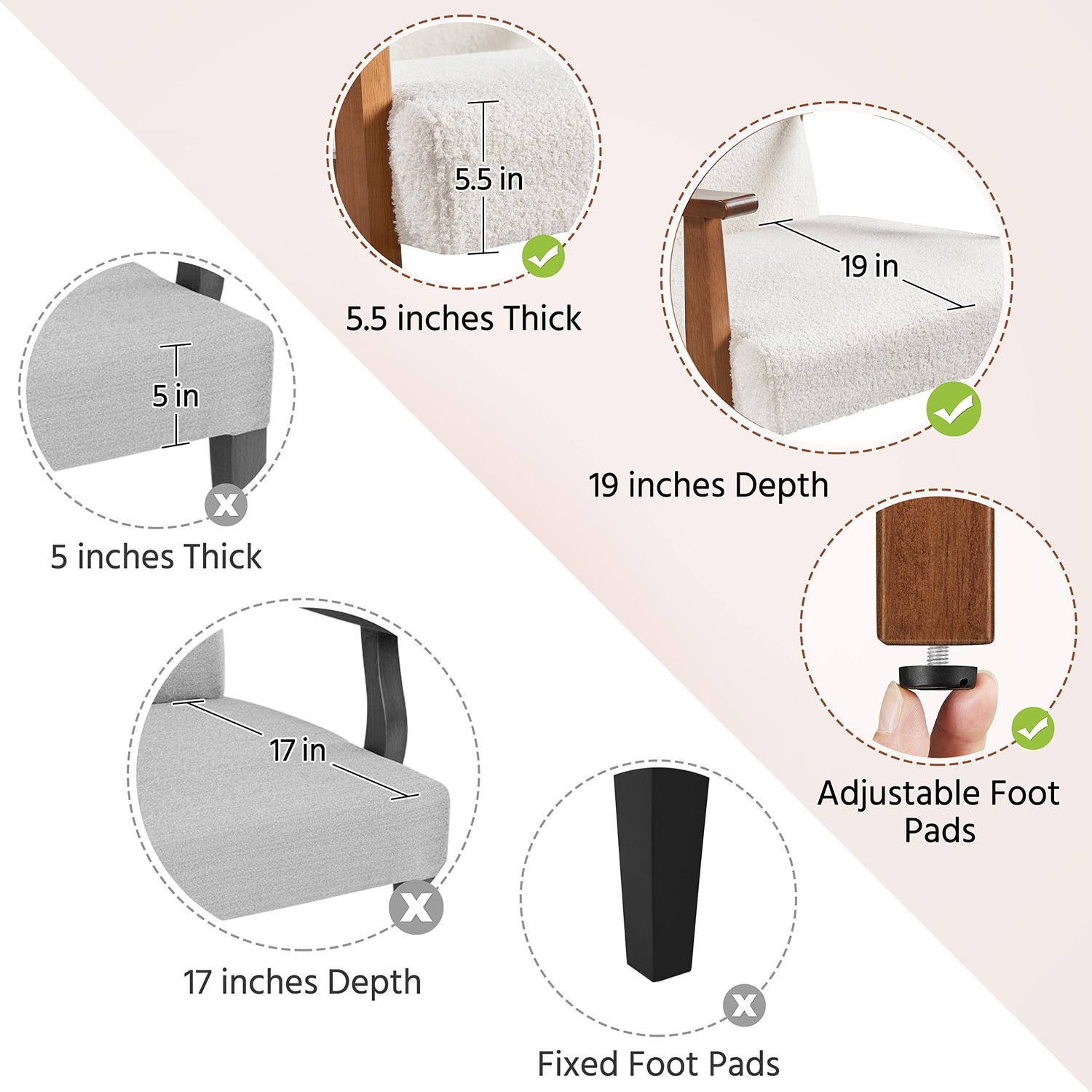 - Superior Construction: This accent chair is built of a solid wood&manufactured wood frame and boucle fabric upholstered seat, giving you a reliable and soft sitting experience. The splayed legs not only provide extra stability but also inject a retro accent to your home. It’s capable of holding up to 136kg/300lb.
