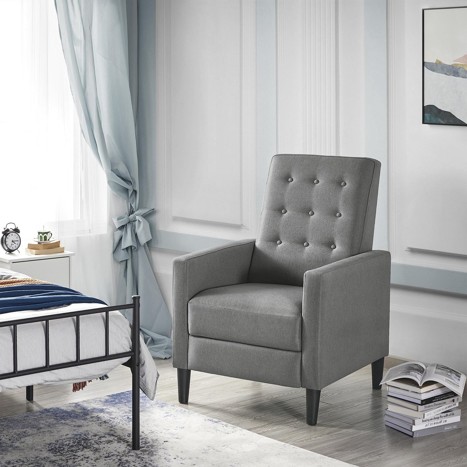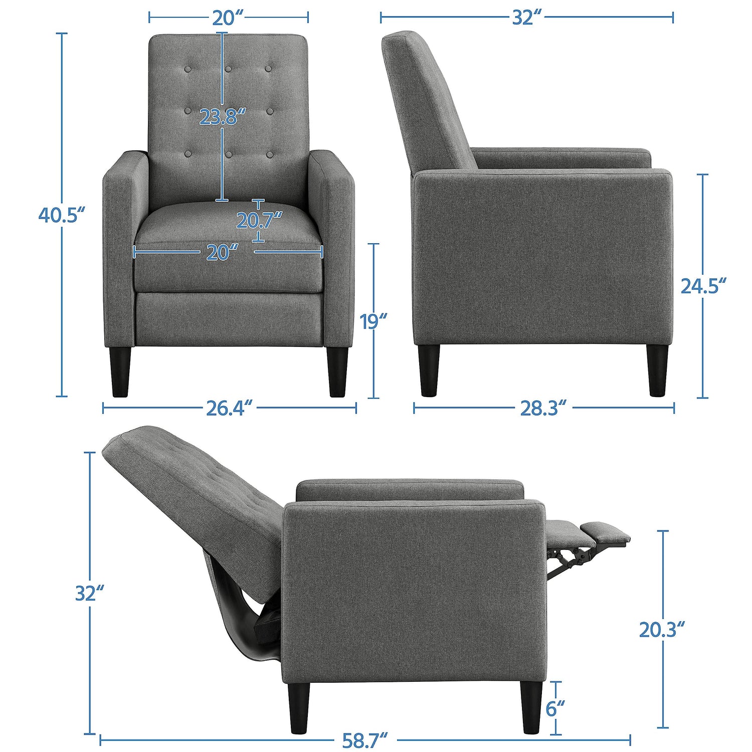 - Compact Size For Small Spaces: With an assembled size of 26.5″ W × 32″ D × 40.5″ H, this modern fabric recliner fits easily in narrow nooks and small spaces like bedrooms, game rooms, small living rooms and more.