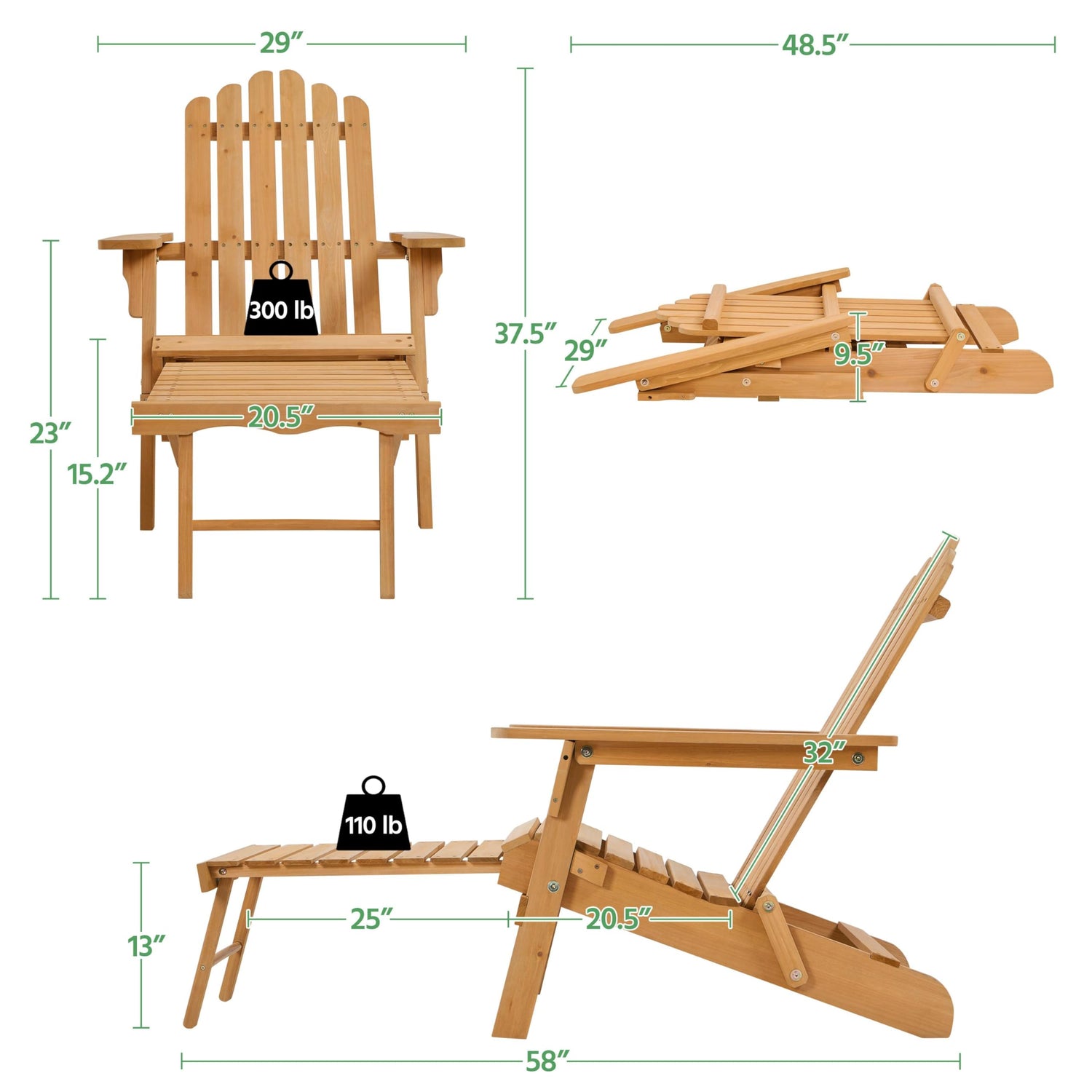 - 【Carrying & Storage-Friendly】This Adirondack lounger is designed with a foldable structure, with a folded dimension of 48.5″ L נ29″ W × 9.5″ Thickness and a self-weight of 22.2 lb. Between the seasons, you can move it wherever you need it, indoors for storage, outdoors for sunbathing, or car trunk for camping by the lake, all up to you