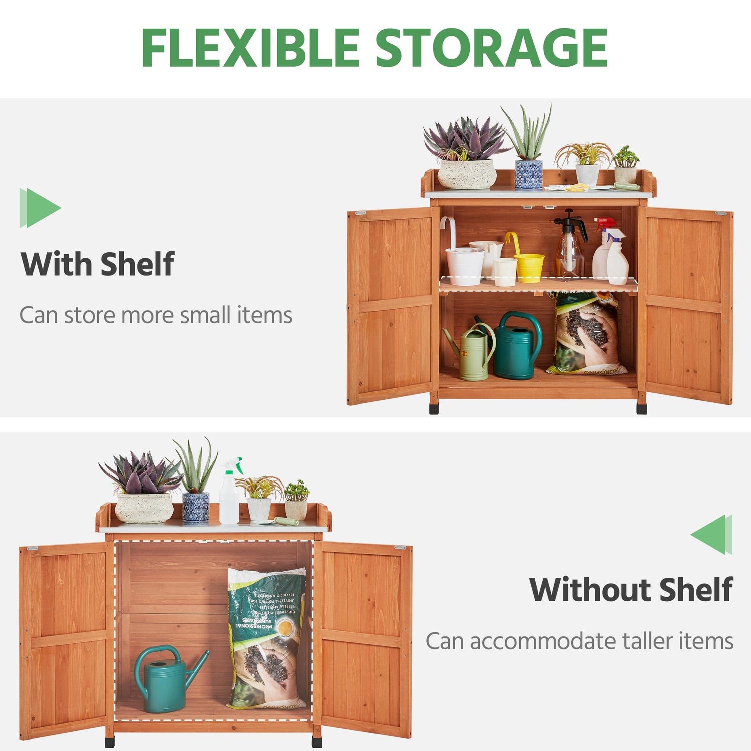 Yaheetech Garden Potting Bench Table - Outdoor Garden Patio Wooden Storage Cabinet & Solid Wood Planting Work Bench with Large Space Storage & Metal-Plated Tabletop, Brown