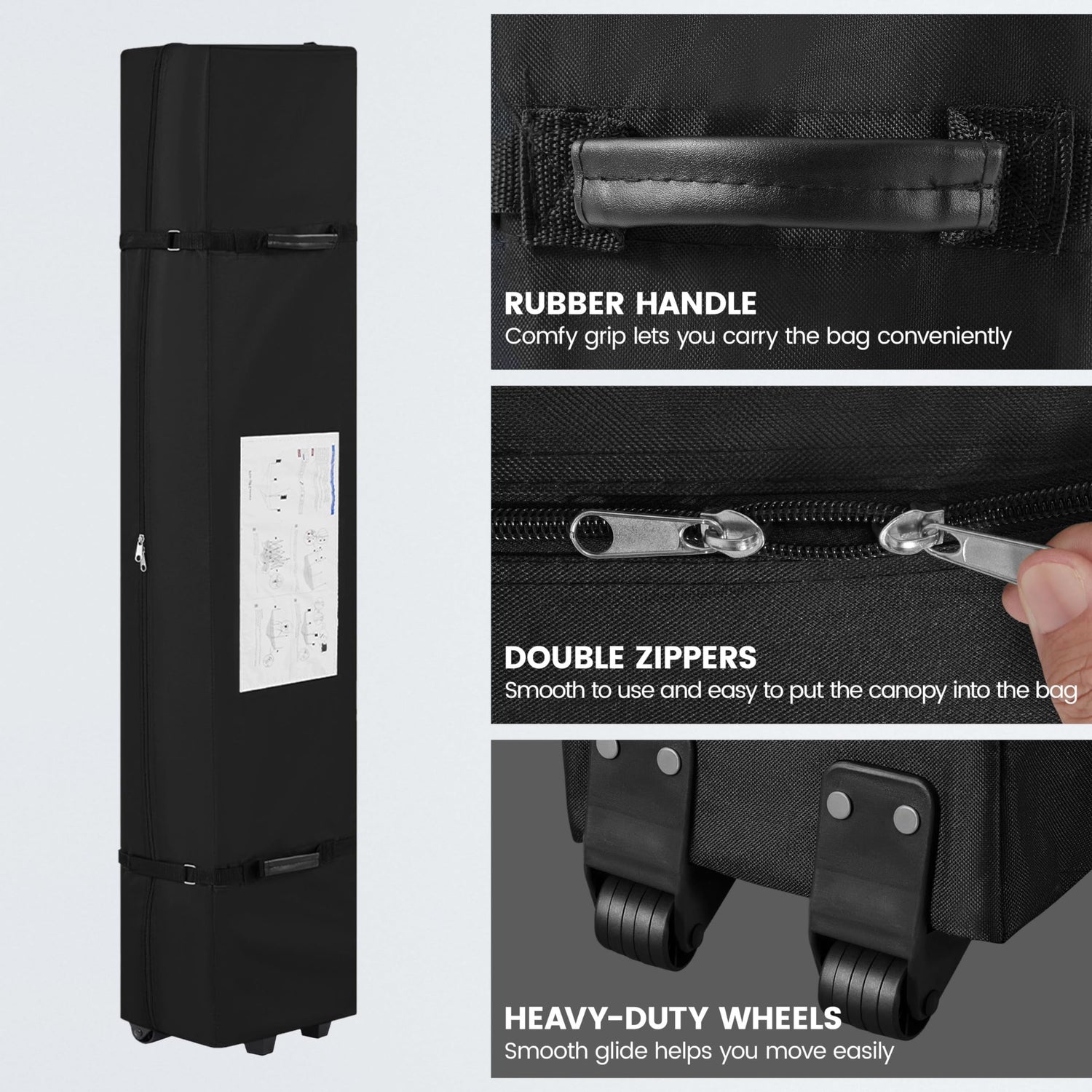- Portable canopy: Thanks to a wheeled bag, you can take this big tent with you for any occasion. The tent can be compactly packed into a carry bag. It is also convenient and space-saving when not in use