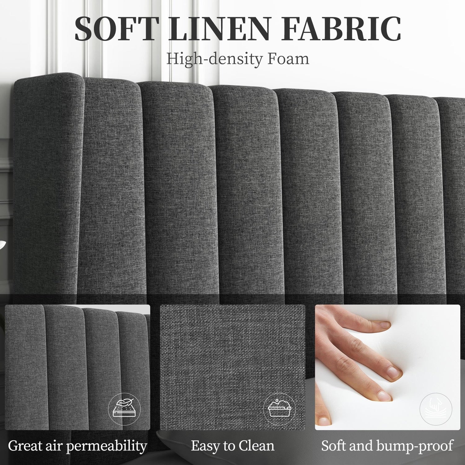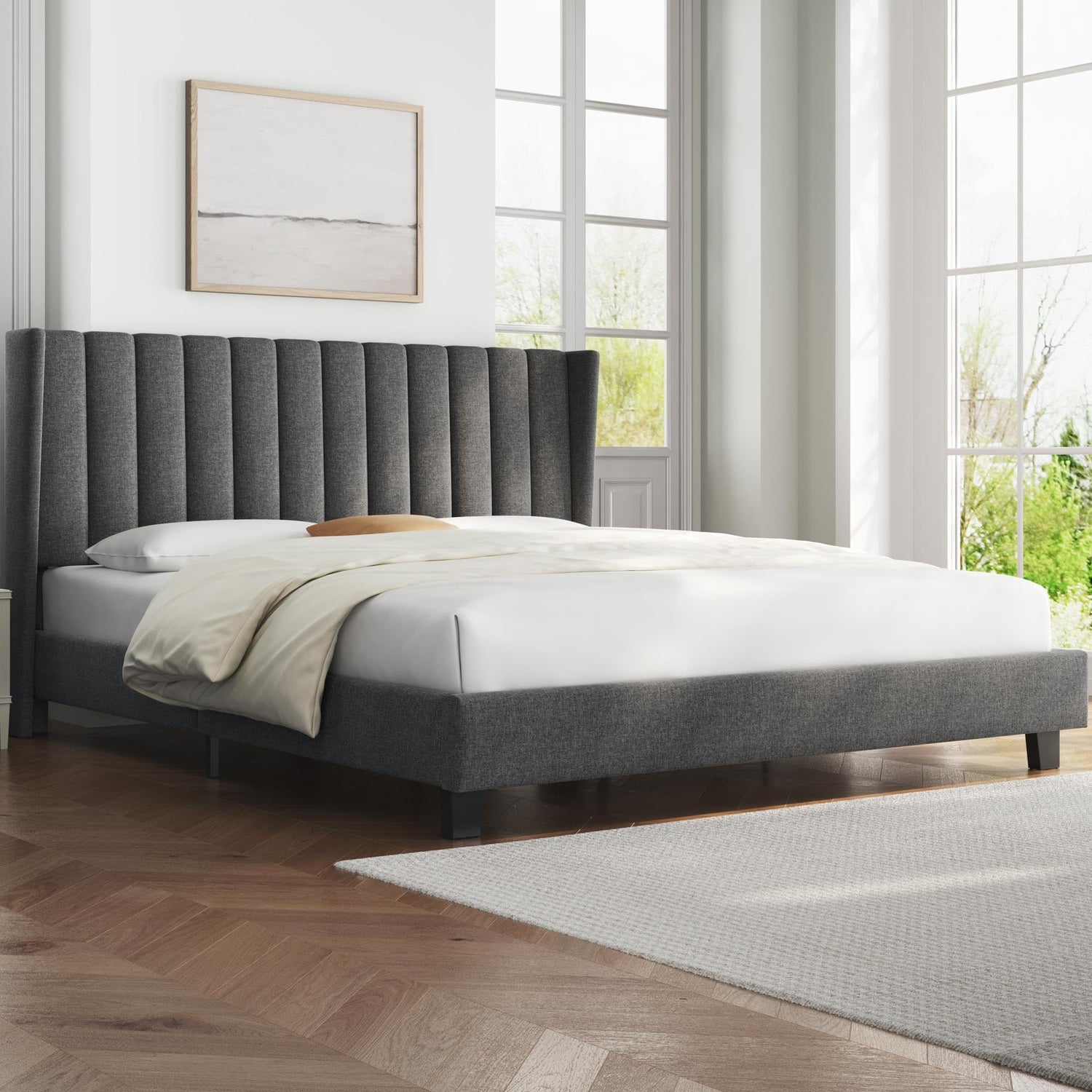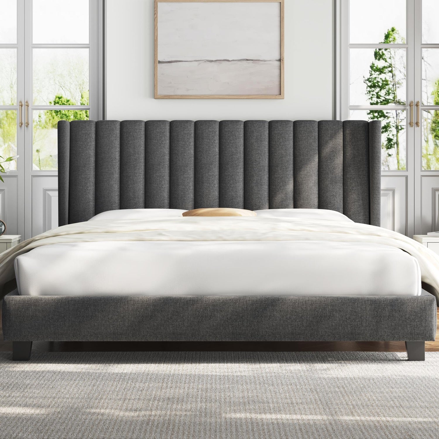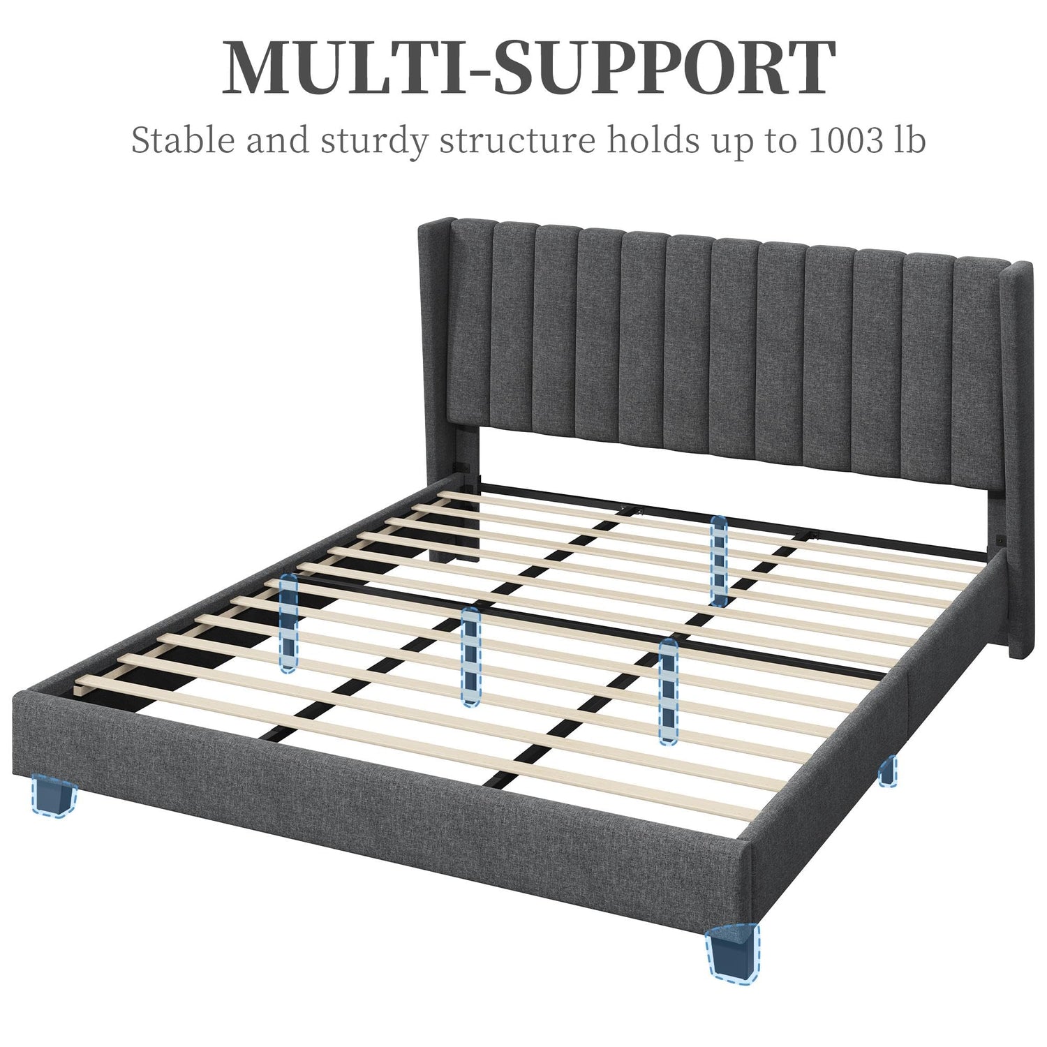 Yaheetech Dark Gray Upholstered King Bed Frame with Wing Design and Wooden Slat Support