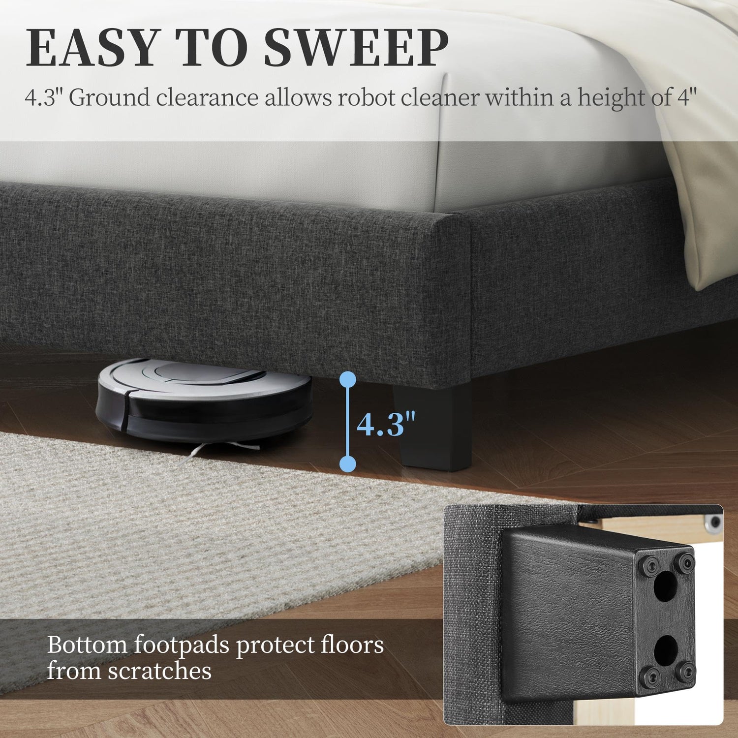 With a thoughtful under-bed clearance of 4.3 inches, this bed frame makes it easy for vacuum cleaning robots to glide underneath, simplifying your cleaning routine and keeping your space tidy. Best of all, the platform design eliminates the need for a bulky box spring, allowing you to place your latex, foam, or spring mattress directly on the wooden slats for a hassle-free setup.
