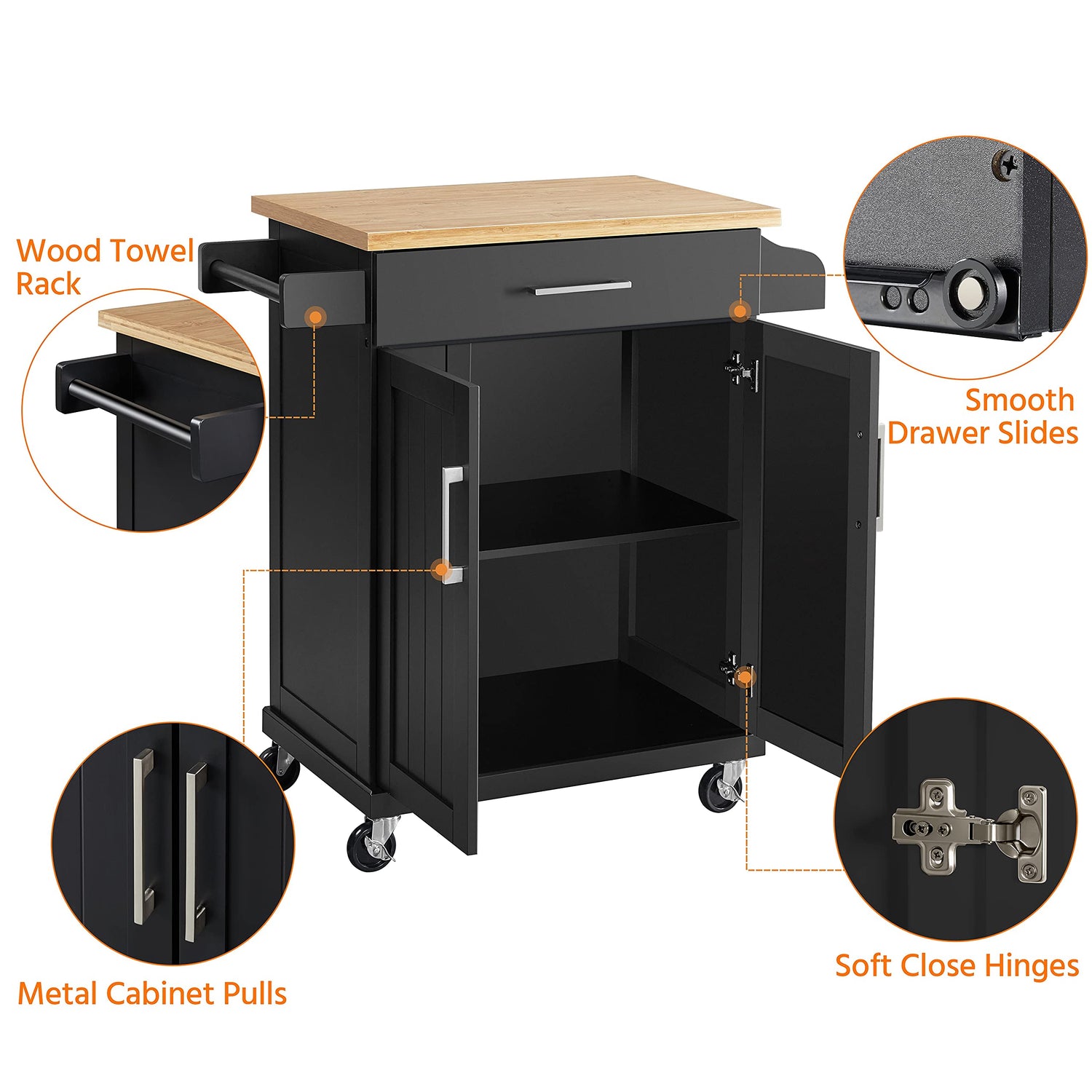 Yaheetech Kitchen Island on Wheels with Storage Cabinet, Rolling Kitchen Cart with Bamboo Top & Drawer & Spice Rack Towel Bar, Microwave Stand Cart for Kitchen/Dining Room, Black