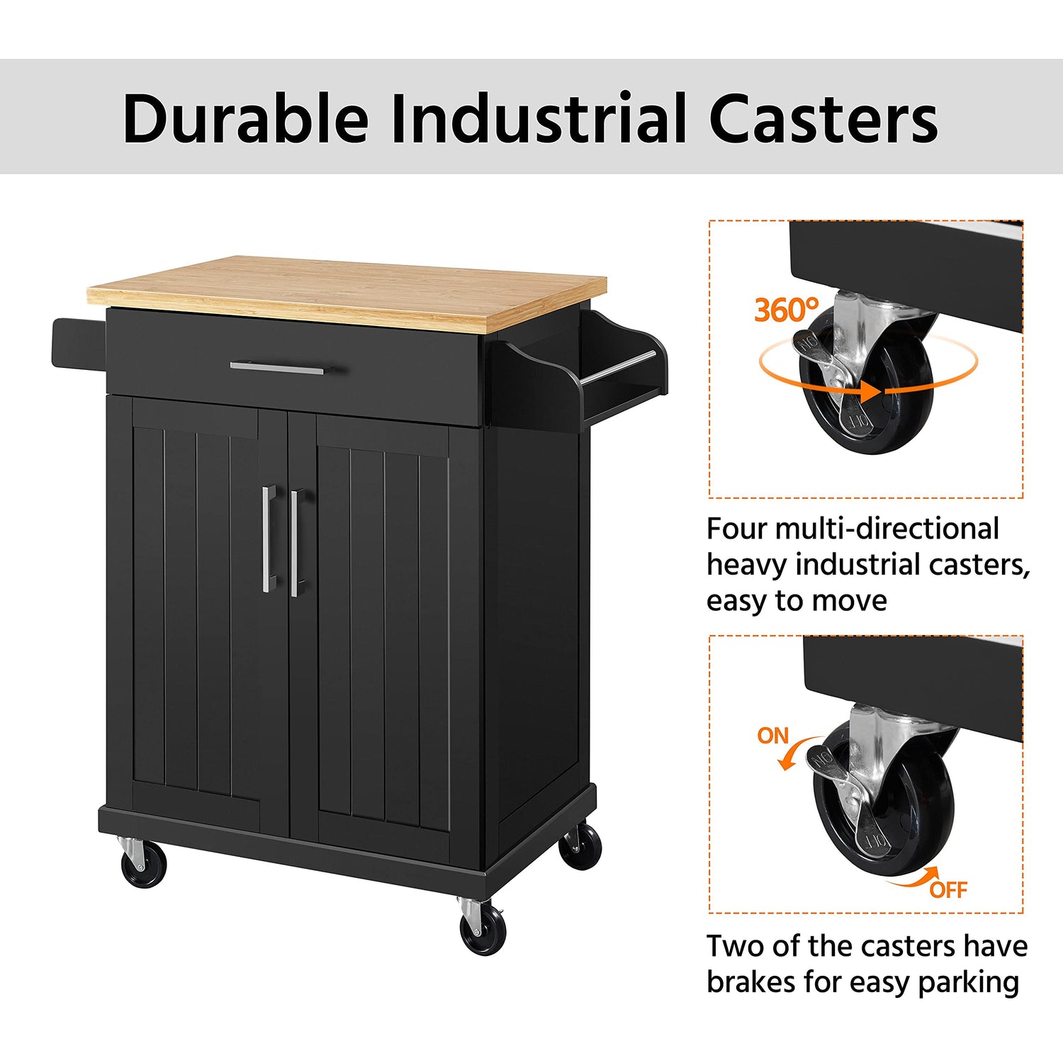 - Movable & Lockable wheels: This kitchen cabinet has four 360° swivel wheels, and two of them are lockable. This design makes the cart move and stop flexibly and allows the cart to go wherever you go to take advantage of your cabinet space.