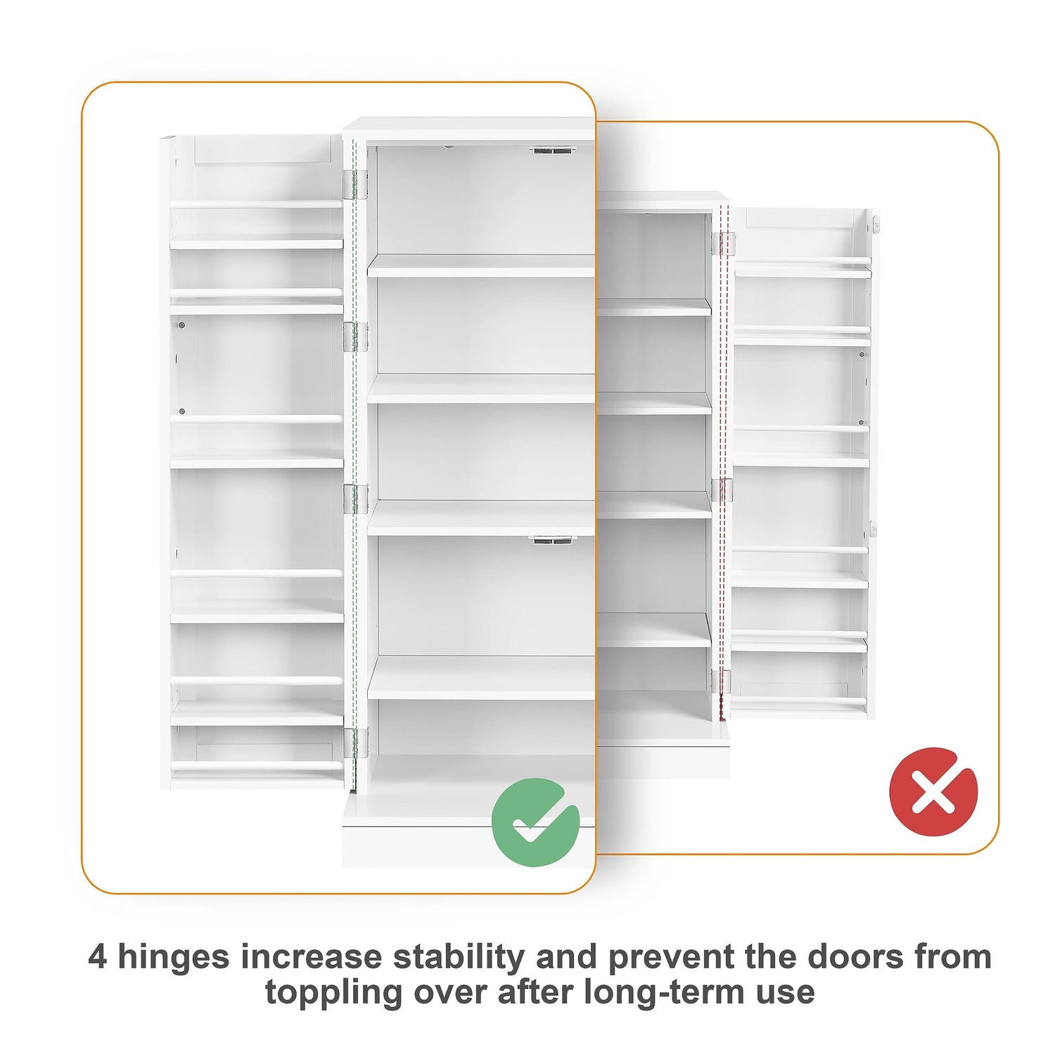 • 【Fine Materials】The kitchen storage unit is constructed of sturdy CARB Phase 2 MDF with a water-resistant surface and firm metal. The base is stable and there are 4 hinges on each door. Metal hinges and corner braces enhance the overall stability. You can open both doors at the same time.