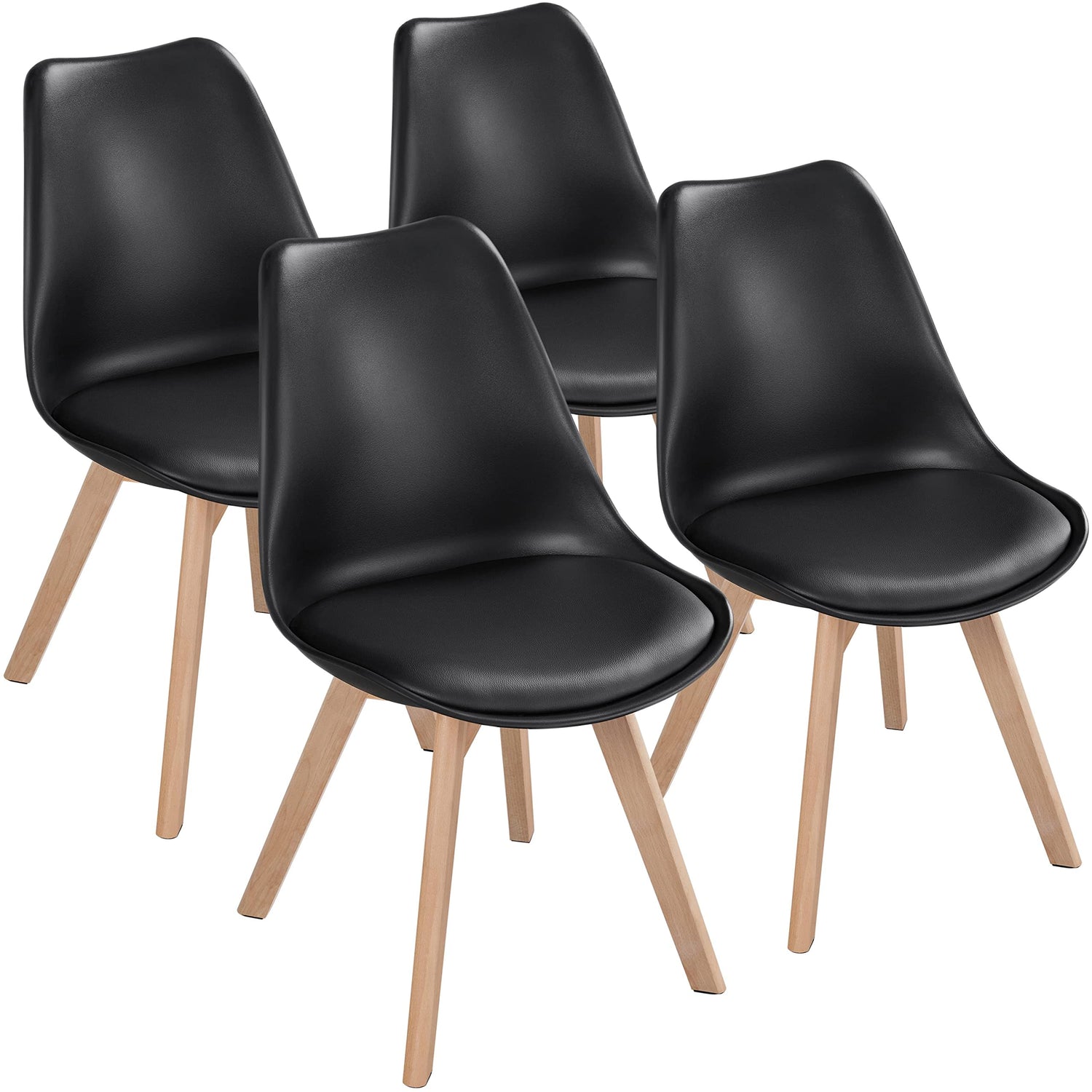 Details: Pack of 4 Dining Chairs Mid Century Modern Style Beech Wood Legs Upholstered Side Chair Soft Padded for Dining Room Living Room Bedroom KitchenQuick overview:Need a set of pretty and multifunctional chairs for your house or office? This set of modern style dining chairs is exactly what you are looking for. These 4 dining chairs are made from selected materials, beechwood, PU, PP, metal, and sponge, good for added comfort and stability. Also, the ergonomic design of suitable height and curved backrest and padded seat support your body comfortably when sitting. They are ideal for living rooms, dining rooms, bedrooms, lobby, reception, waiting rooms, banquets or office!Specifications:Material: PP, PU, Beech Wood, SpongeOverall dimension: 19.5 x 20.5 x 32inch (L x W x H)The size of the cushion:17.7 x 15.4 inchSponge thickness: 0.6 inchGW: 48.1 lb/NW: 42.3 lbMax weight capacity:286.6 lbColor: BlackPackage included:4 x Dining Chairs1 x InstructionNote:Please allow ±0.4inch error due to manual measurement.Please do not stand on the chair for your safety.retro chairs break room chairs Soft Padded Shell Chair Accent Side Chairs mid century dining chairs