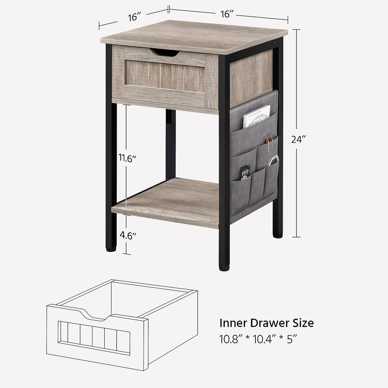 - 【1 Drawer, 1 Shelf, 1 Bag】This industrial bedside table comprises a drawer, a lower open shelf and an extra fabric bag. You can store your frequently-used gadgets in the drawer and other bigger things on the lower shelf. A 6-pocket hanging bag keeps remote controls, pens, magazines, and other items organized, and it can be attached on either the right or left side for your convenience.