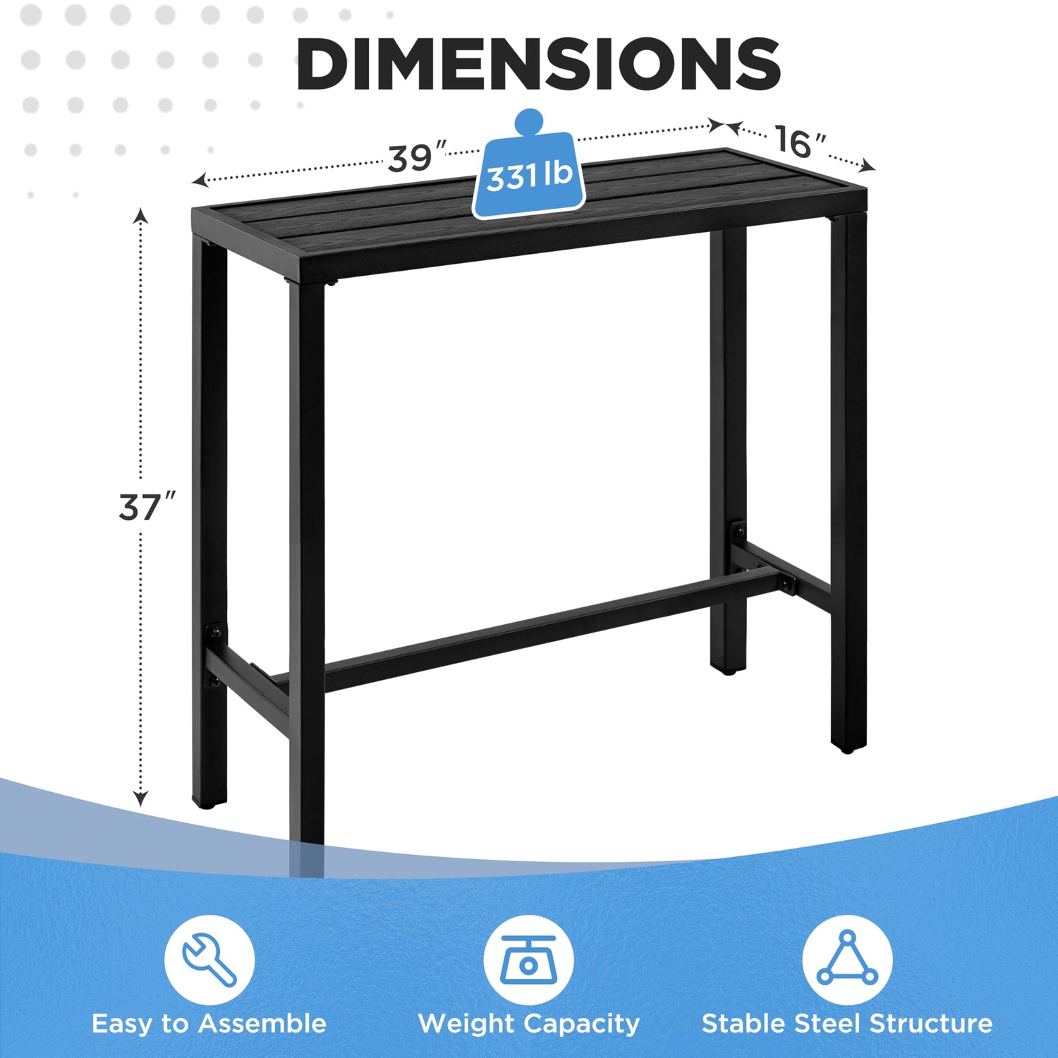 - Understated Design: Crafted with precision, this elegant patio bar height table blends sleek black hues with a modern slatted design. The simple, clean lines create a harmonious accent, making it a stylish addition to your deck, porch, garden, lawn, or backyard