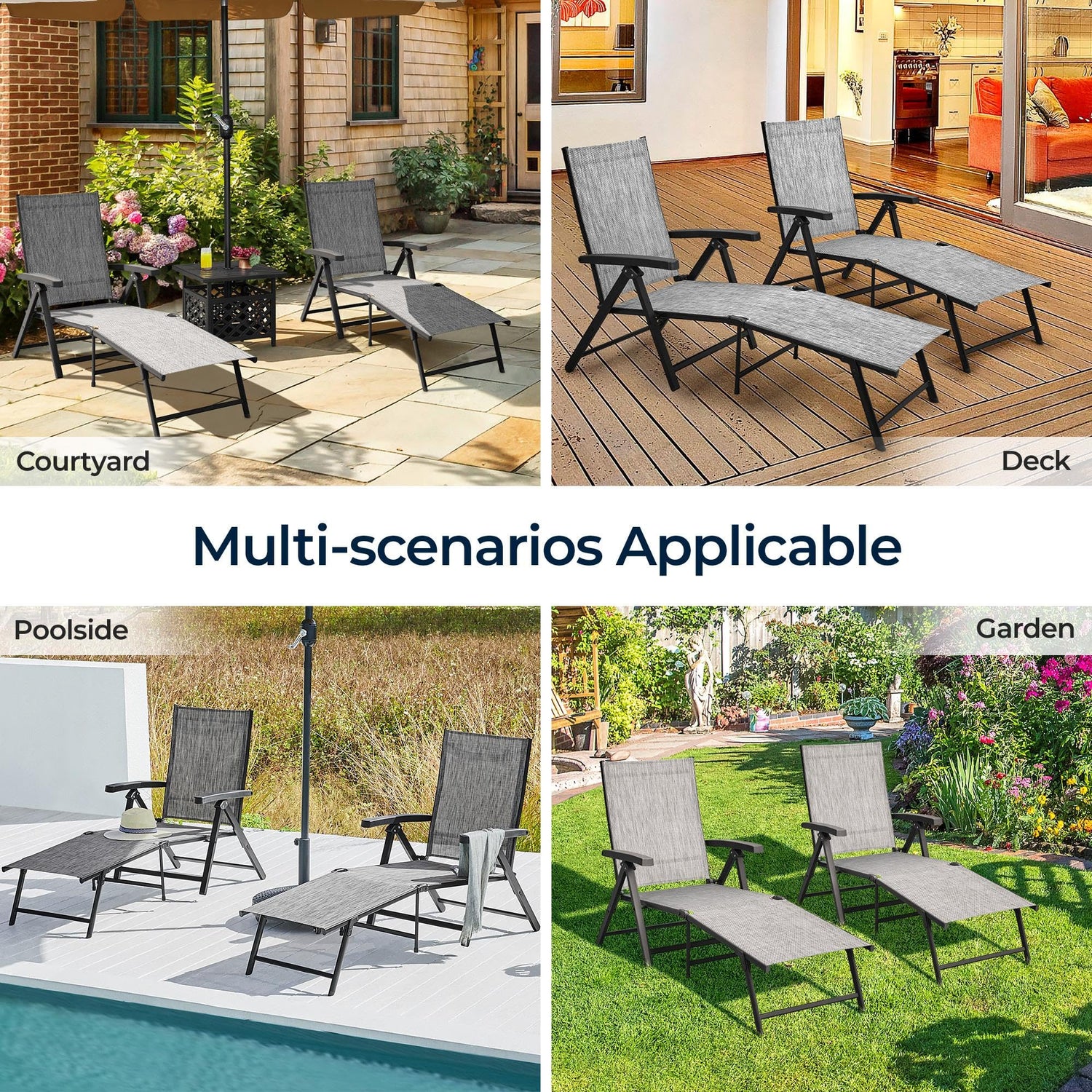 - 7 Adjustable Backrest Angles: The 52 cm/ 20.5″ wide backrest of this patio chaise lounge bedfeatures 7 available angles to suit your diverse needs, such as reading orsunbathing on the beach or taking a carefree nap in the lush early summergarden. You can effortlessly lift or drop the back and firmly fix it at yourdesired angle