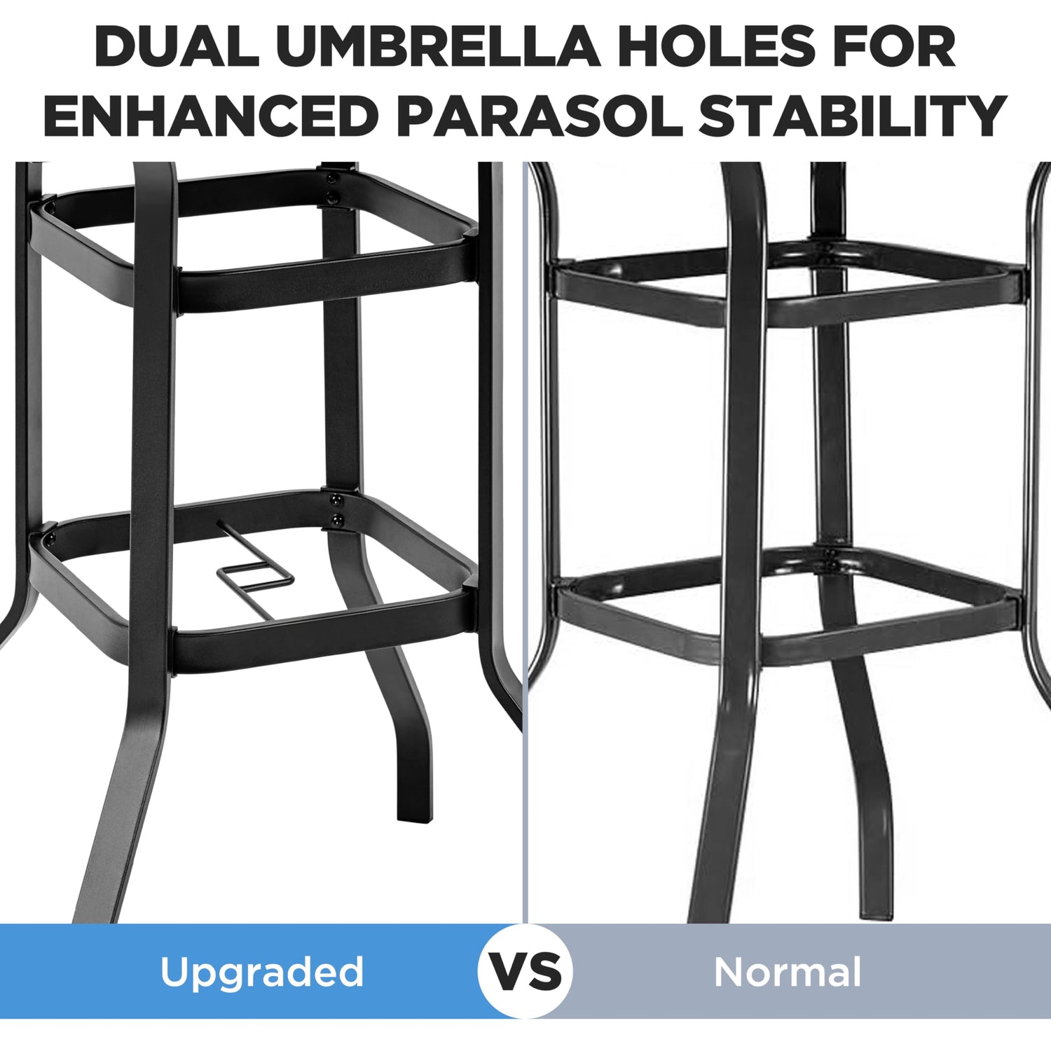 - Umbrella Hole: The 1.5" diameter hole in the slatted metal tabletop allows for the easy addition of a colorful umbrella, providing shade and protection from the sun or unexpected rain showers and enhancing comfort for your guests. A 6.5-8ft umbrella is suitable for this outdoor bistro table