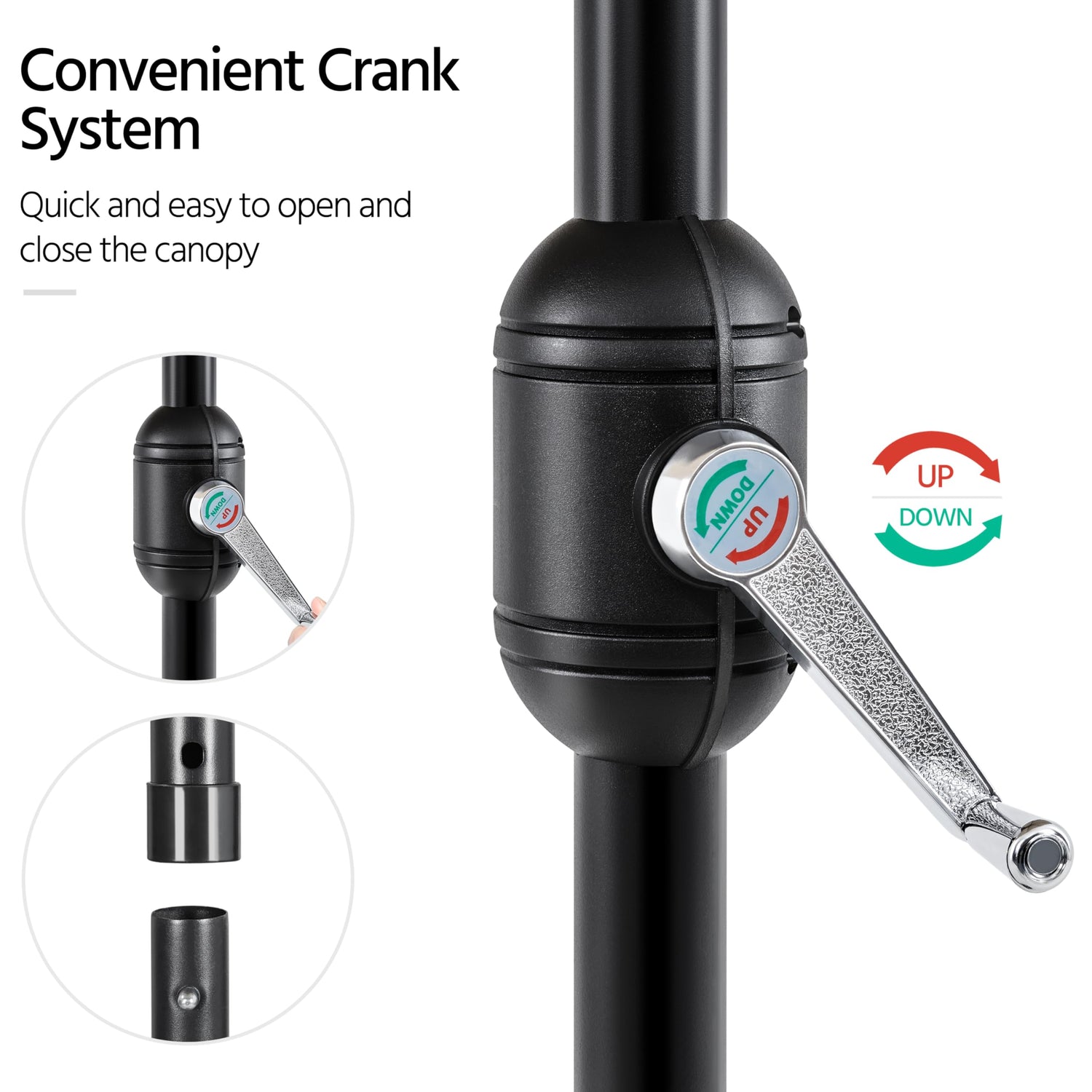- Handy Crank Operation: This 7.5ft market umbrella features a crank mechanism for easy, independent opening and closing of the canopy. The design also allows for quick closure in case of sudden gusts, helping to reduce risks during bad weather