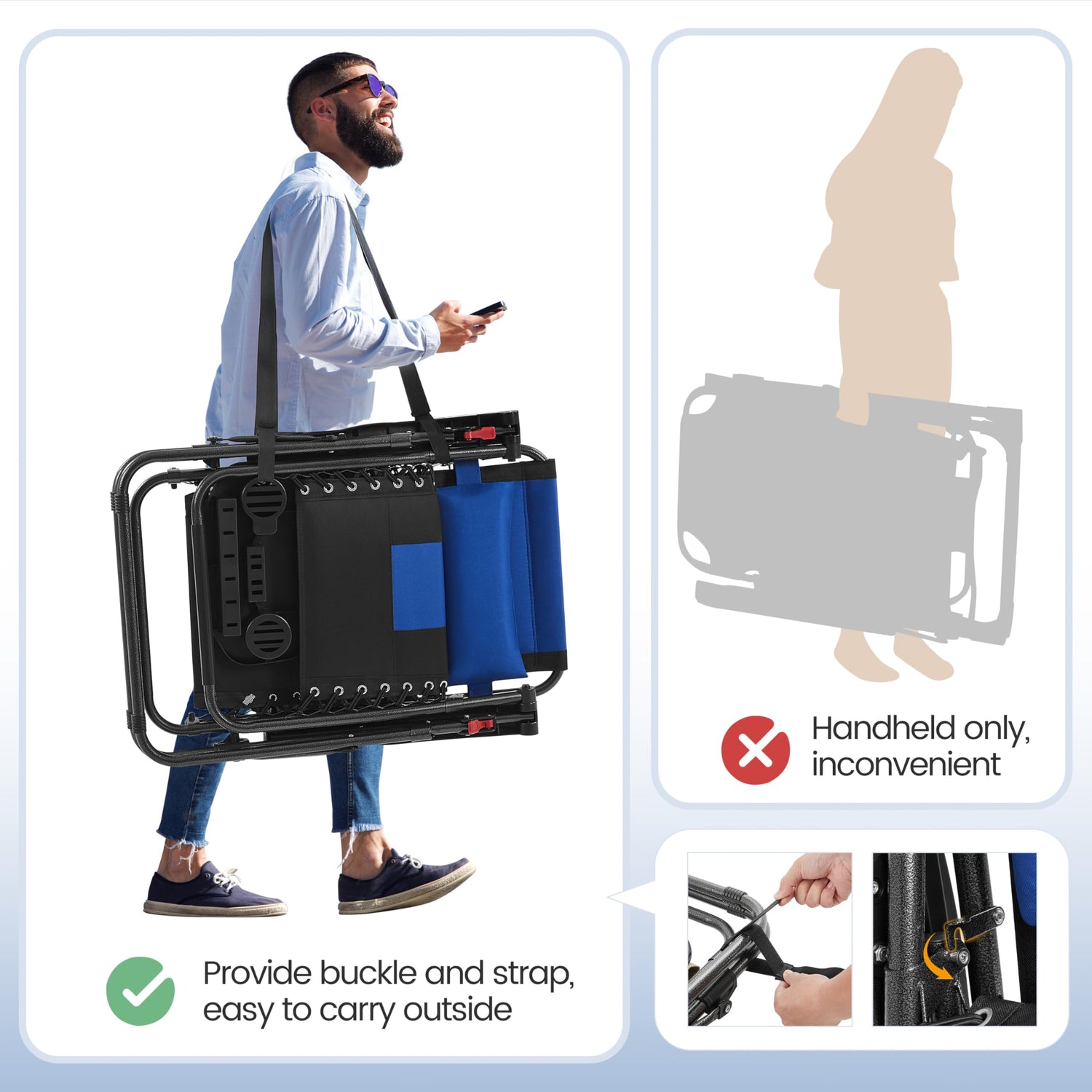 - Buckle & Strap for Carry Out: By simply locking the buckle, you can keep this foam-padded outdoor chair in the folded mode without loosing. The included strap allows you to shoulder it out or move somewhere else without needing to carry it in the hand