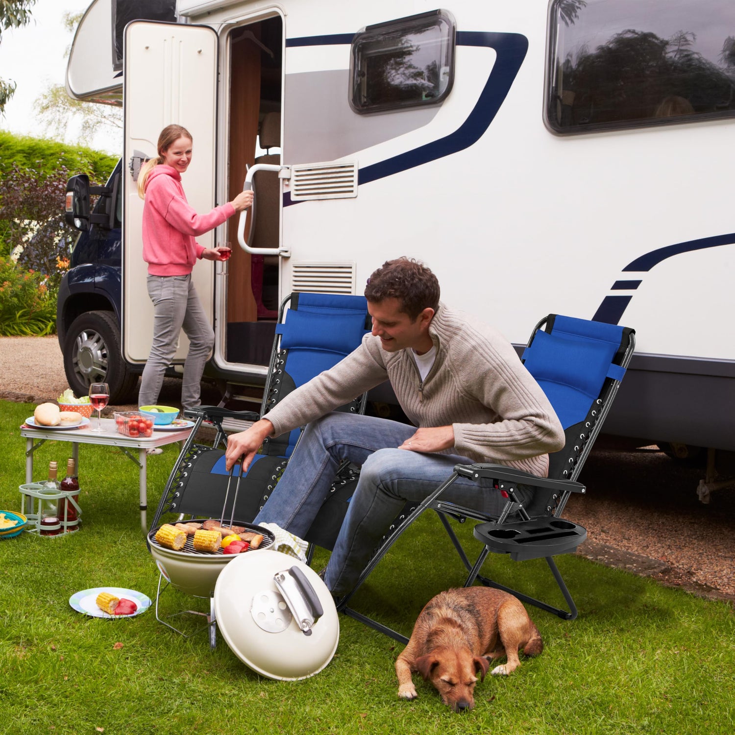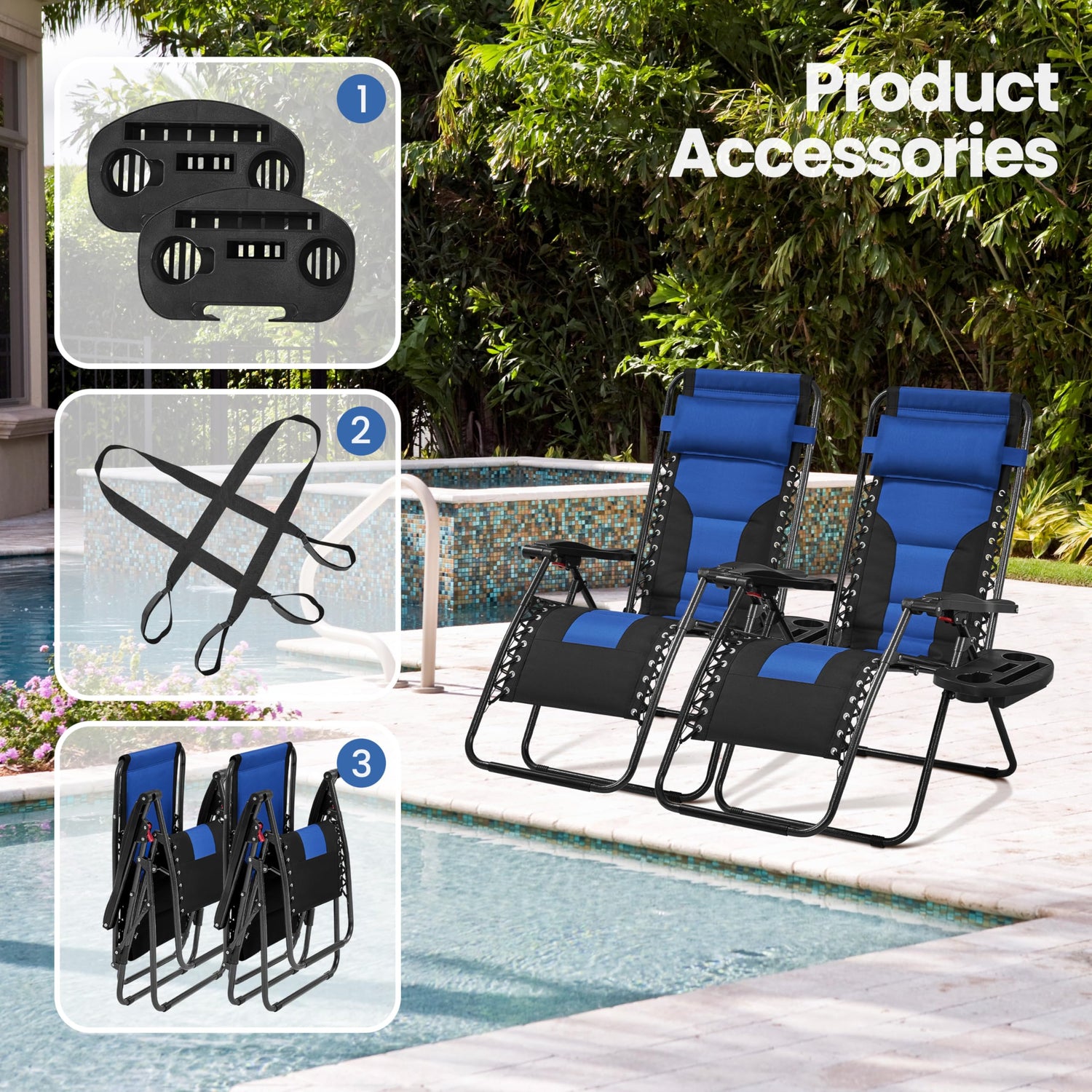 Yaheetech Padded Zero Gravity Recliner, Foldable Outdoor Patio Chairs, Adjustable Anti Gravity Lounger for Backyard Camping w/Carry Strap, Cup Holder, Pillow Navy Blue/Black Set of 2