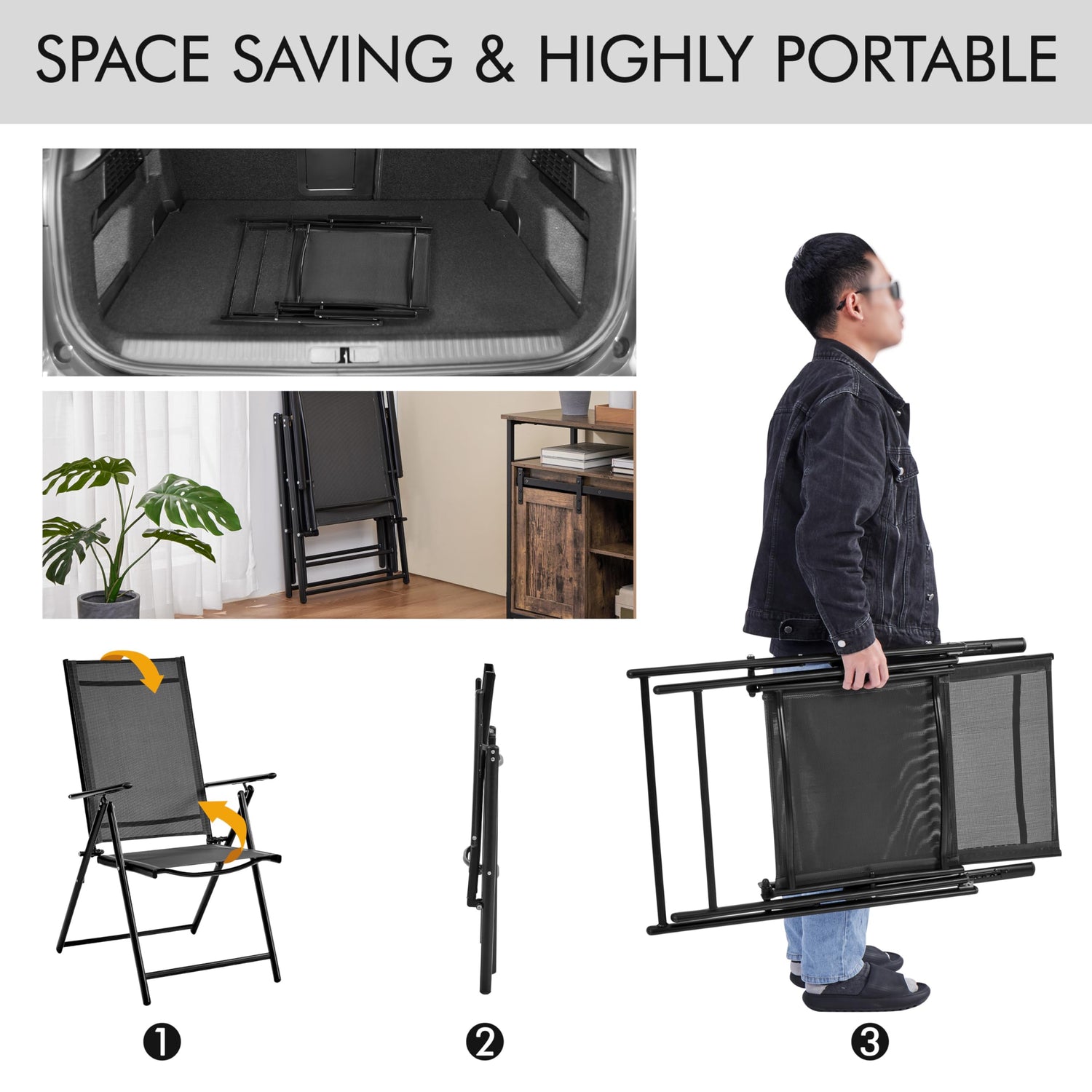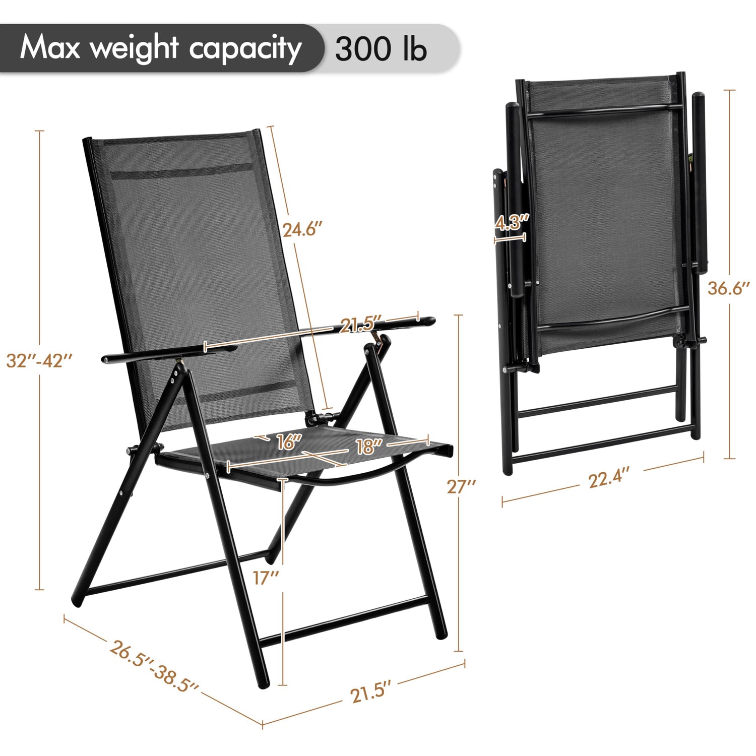 - Foldable for Easy Storage: This patio dining chair is designed to be foldable with a folded size of 36.6″ L × 22.4″ W × 4.3″ Thickness and weighing 12 lb. The compact folded size and lightweight make it stress-free to store in your garage, trunk room, or on a storage rack