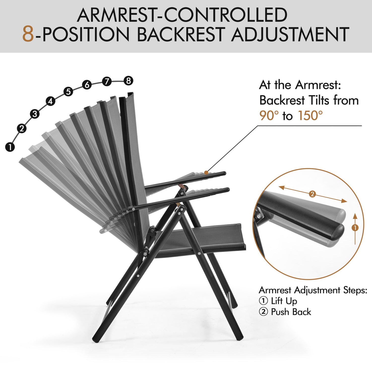 Yaheetech Patio Folding Dining Chairs Set of 2, Stackable Outdoor Lawn Chairs with 8 Adjustable Back Positions and Armrest for Garden, Lawn, Yard and Beach, Dark Gray
