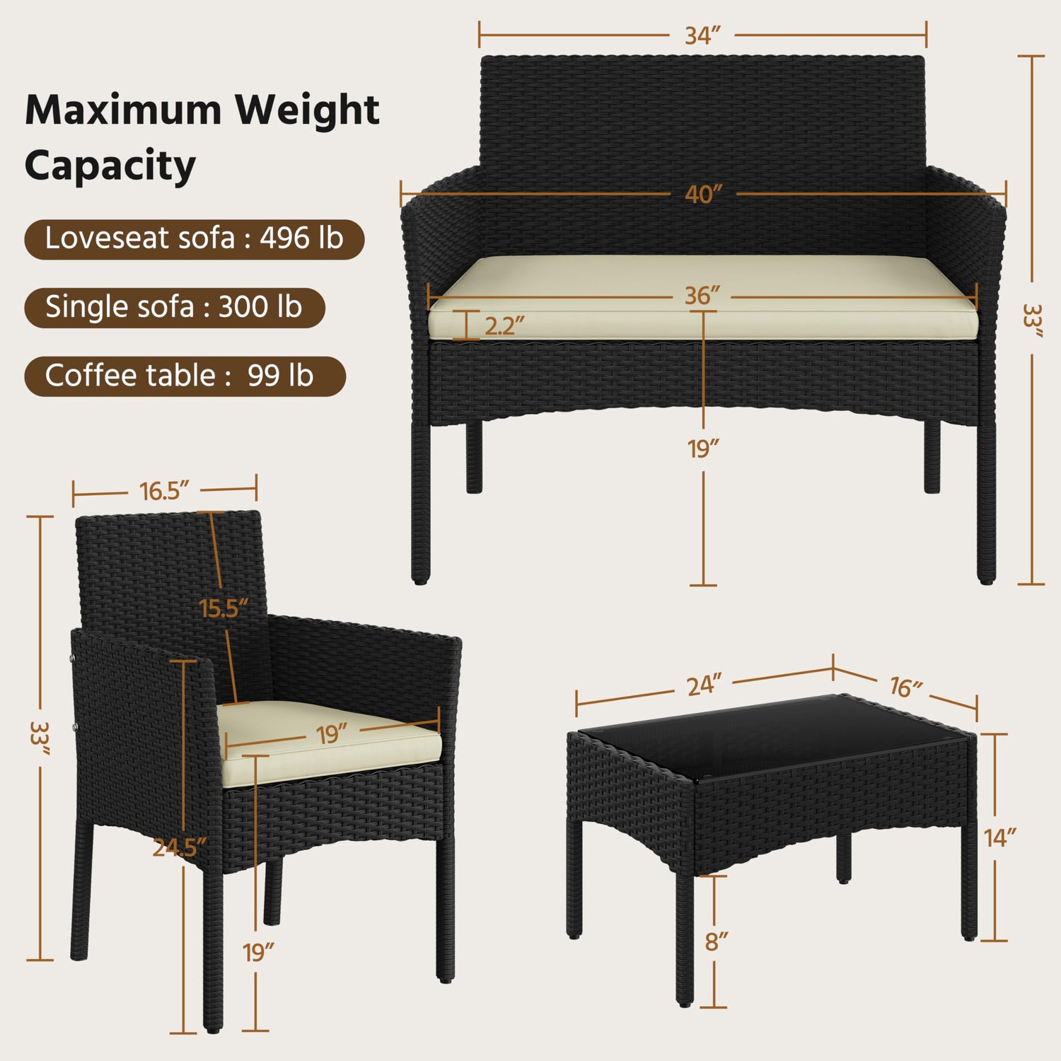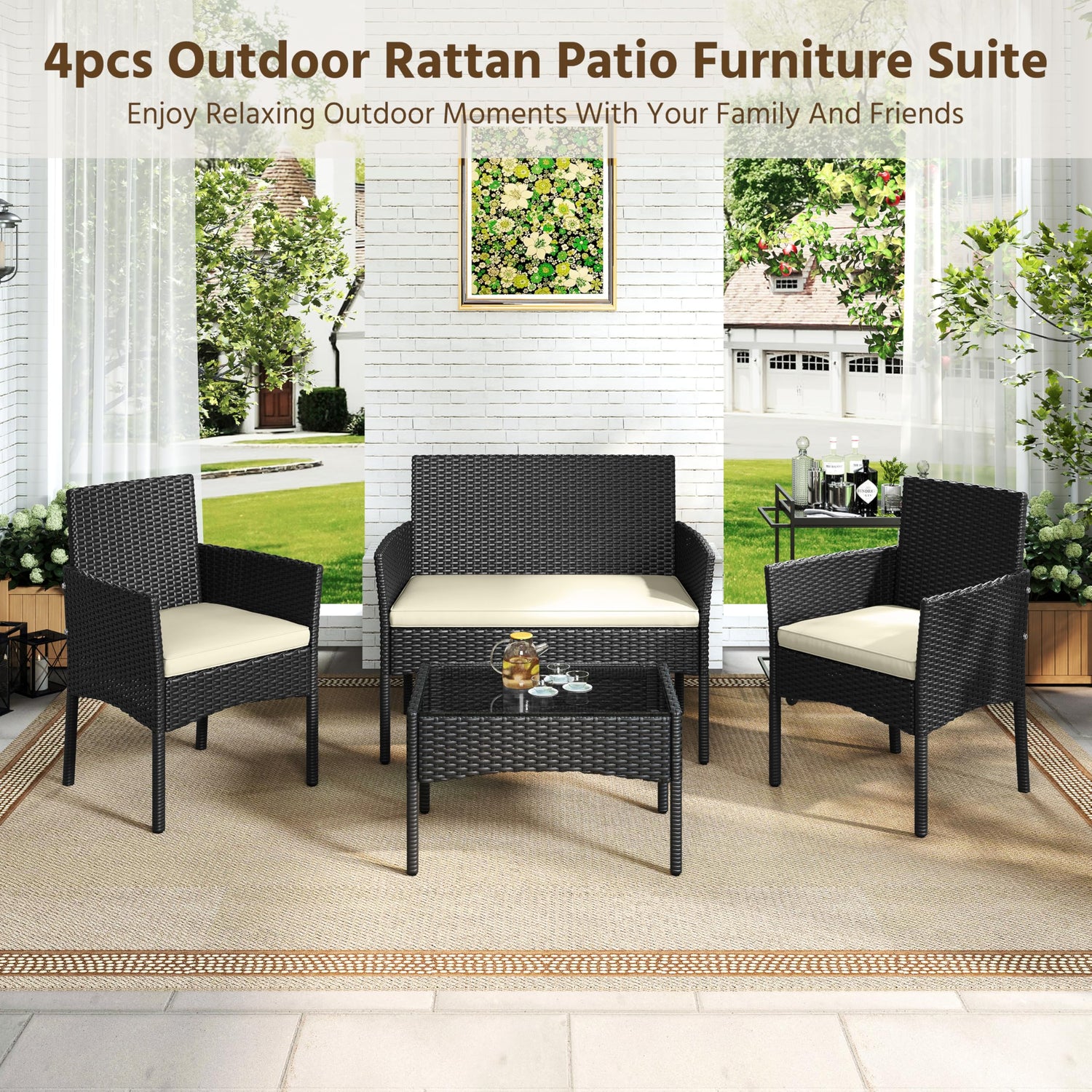Yaheetech Patio Furniture Set 4 Pieces Conversation Sets, Rattan Chair Wicker Set Loveseat with Soft Cushion and Glass Table for Backyard Porch Garden Poolside Balcony, Black and Beige