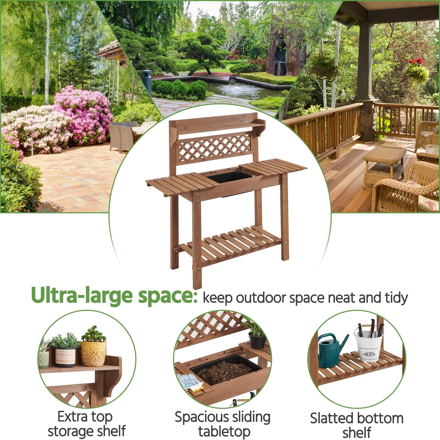 Details: Garden Potting Bench Outdoor Planting Table Wooden Work Station Table w/ Sliding Tabletop Open Storage Shelf