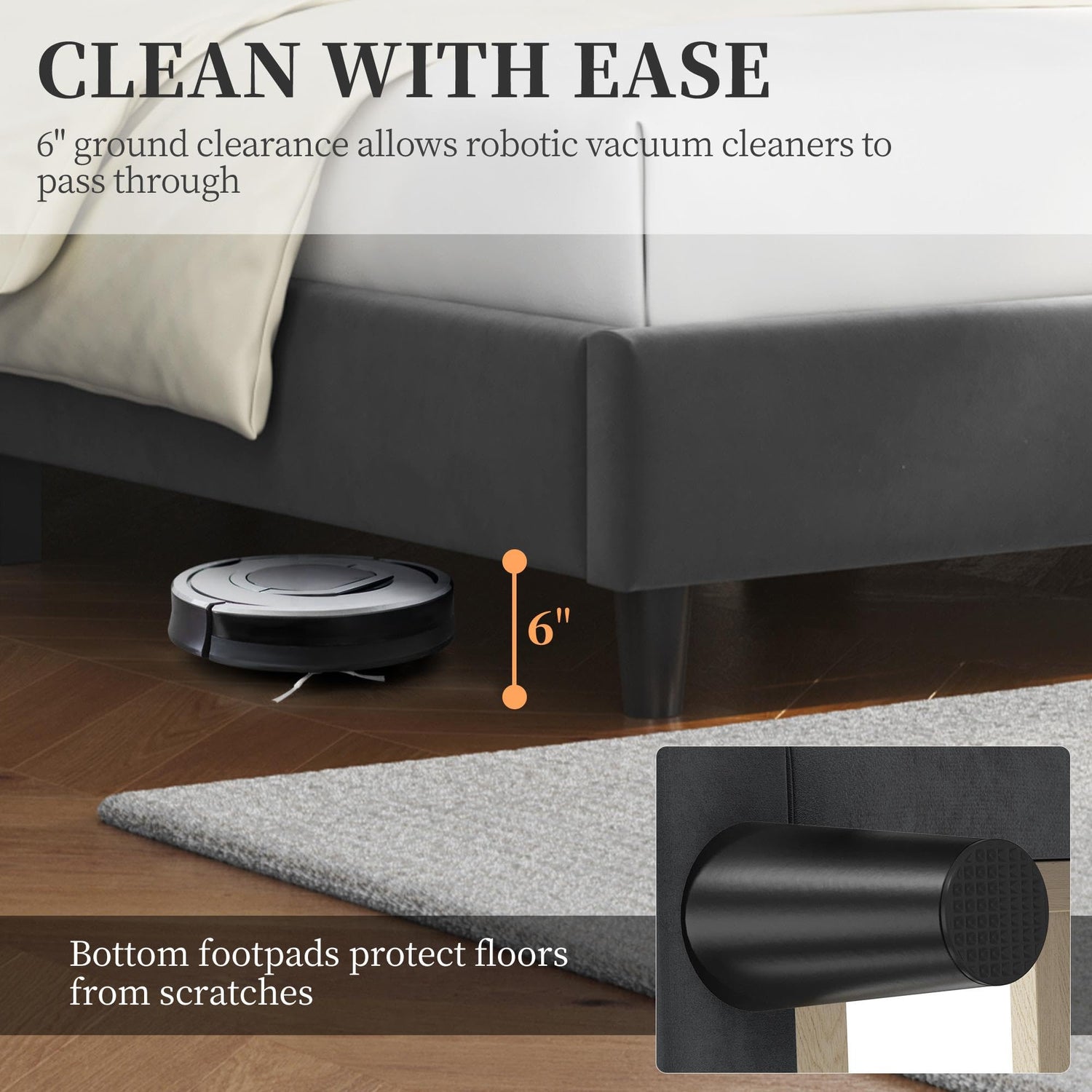 - Reasonable Under-bed Space: 6" ground clearance allows vacuum cleaning robots to pass through easily, making cleaning this queen bed frame a breeze for you