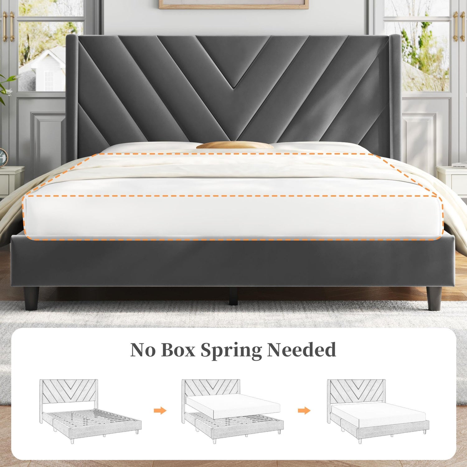 - Wing Side Design: Designed with a wing side on the wide upholstered headboard and skin-friendly velvet fabric, the queen bed frame can be a must-have in any restful retreat. (No Box Spring Needed)