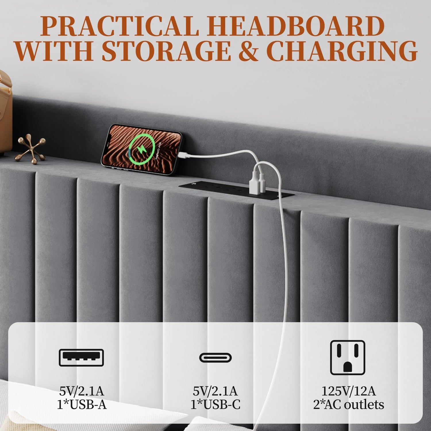 - 4 Charging Ports Built-In: This queen bed frame with headboard features a built-in power strip with two AC outlets and two USB ports, allowing you to effortlessly charge your phone, tablet, power bank, headphones, or desk lamp from the comfort of your bed