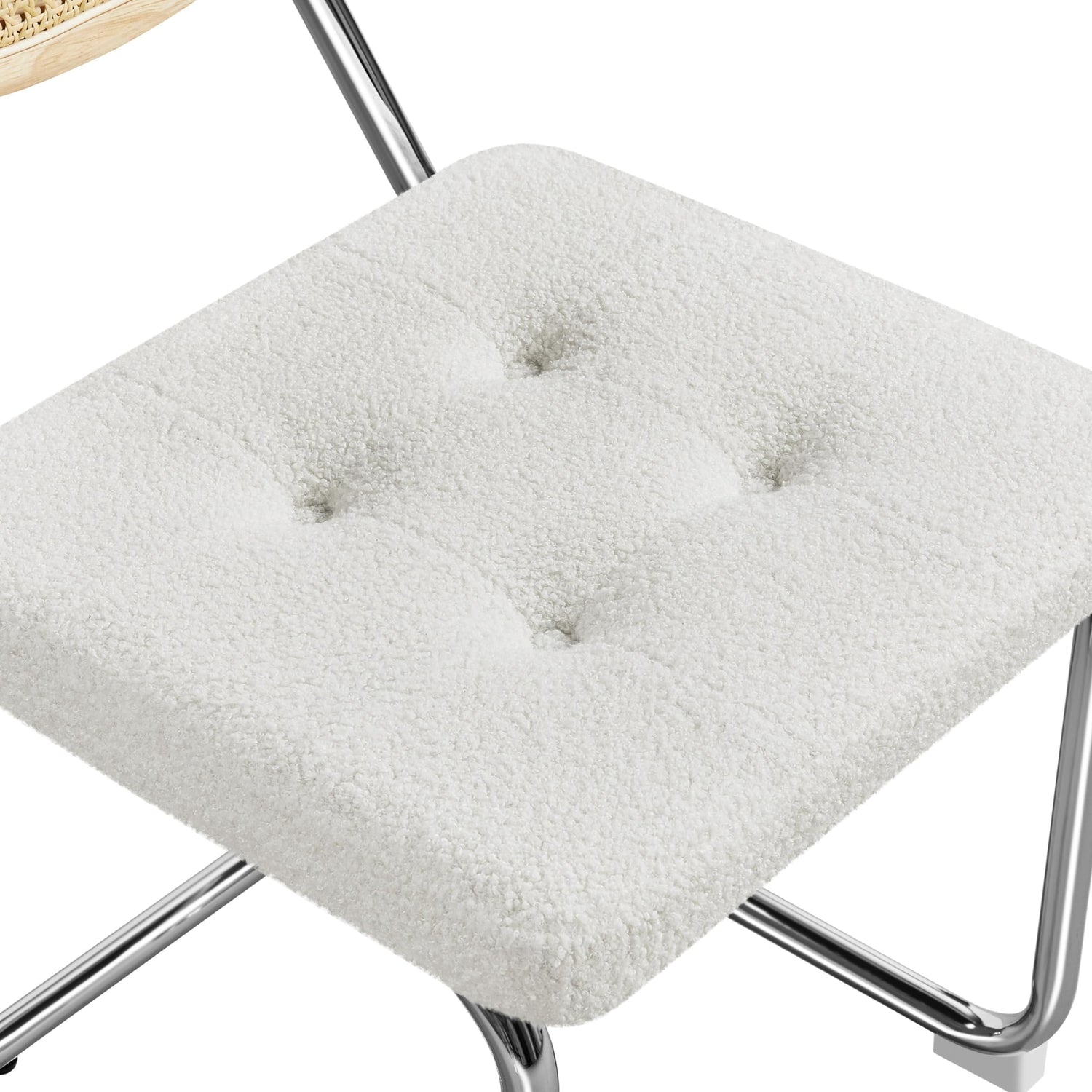 - Faux Rattan & Boucle Combination: These kitchen chairs stand out with their combination of synthetic rattan and polyester boucle. Fluffy boucle upholstery brings hours of comfort during meals or socializing, while the breathable mesh rattan back provides a cool and dry experience even after prolonged contact.