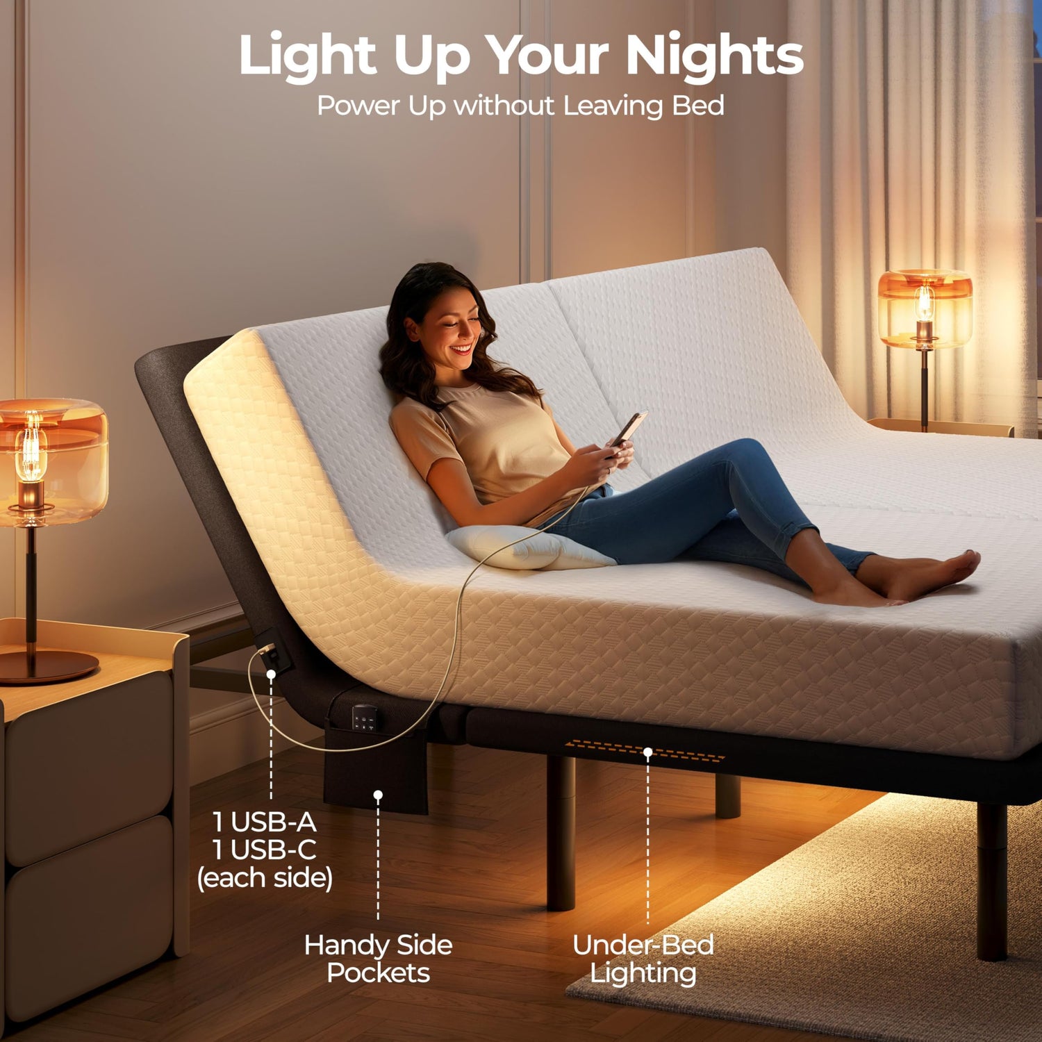 - Convenience at Your Fingertips: This thoughtfully designed adjustable bed base offers more than sweet dreams. Light up the night with under-bed LEDs, charge up with handy USB-A and USB-C ports, and keep your essentials close in the removable side pockets