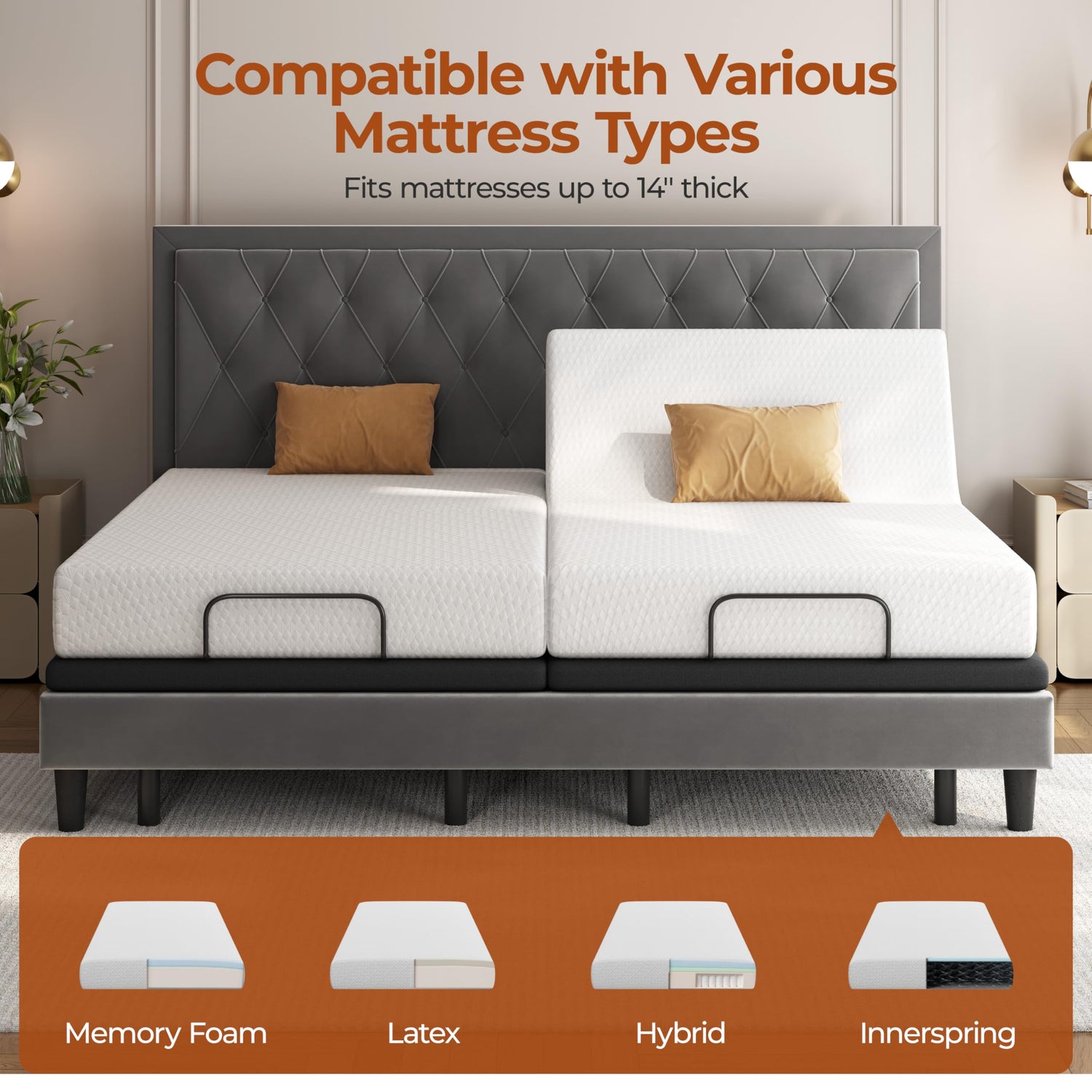 - Split King Flexibility: This split king bed frame combines two twin XL frames for versatile use. Use one remote to sync both frames for couples or separate remotes to independently adjust positions, offering tailored support for each user