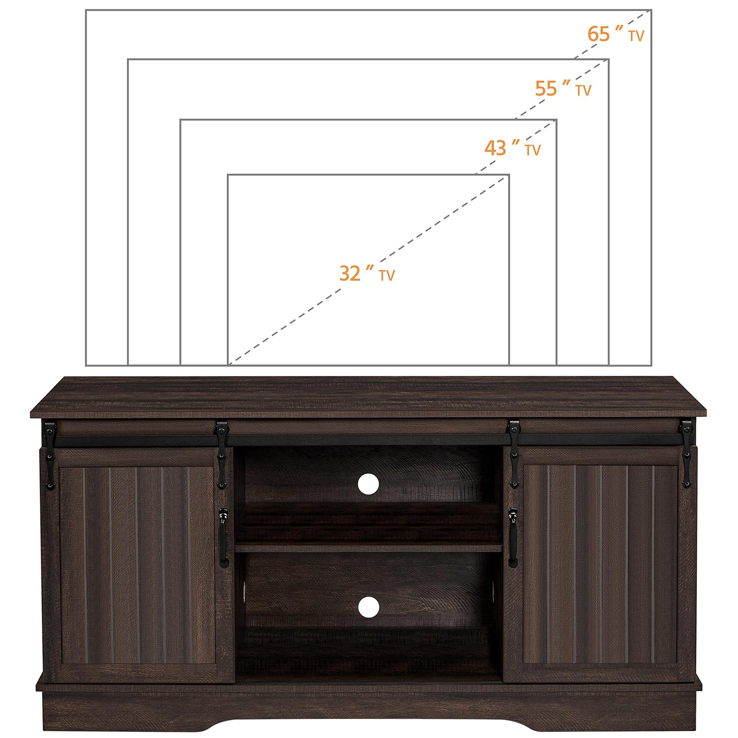 Details: Industrial Sliding Barn Door TV Stand Media Console Table Storage Cabinet Looking for a practical while nice-looking TV stand and having tired of traditional boring style? This industrial storage TV stand with sliding barn doors may satisfy you!Taking into account both the functions of traditional TV stands and modern aesthetic and upgrading storage capacity, this TV stand comprises 6 storage cabinets and features an industrial-chic style. Appliances like a CD player and a sound box as well as various items like cups, tea caddies and gamepads can all be housed in a clean and ordered way.Besides, we replace traditional doors with sliding barn doors, more smooth, convenient, and flexible to use, meanwhile, adding a vintage vibe to your tasteful house.Specifications:Material: MDF, particle board, ironColor: Dark WalnutDimension: 58 x 16 x 28’’ (L x W x H)Adjustable Division Board Adjustable Height: 9’’, 12’’, 14’’;Upper Center Shelf: 9 x 23 x 14’’ (L x W x D)Lower Center Shelf: 11.5 x 23 x 15’’ (L x W x D)Max. Bearing: tabletop:152 lbN.W.: 85 lbG.W.: 92.5 lbNote:Please allow ±0.4’’ errors due to manual measurement.Please do not place items that exceed the max. weight capacity of this table.Package included:1* TV Stand1* Instructions