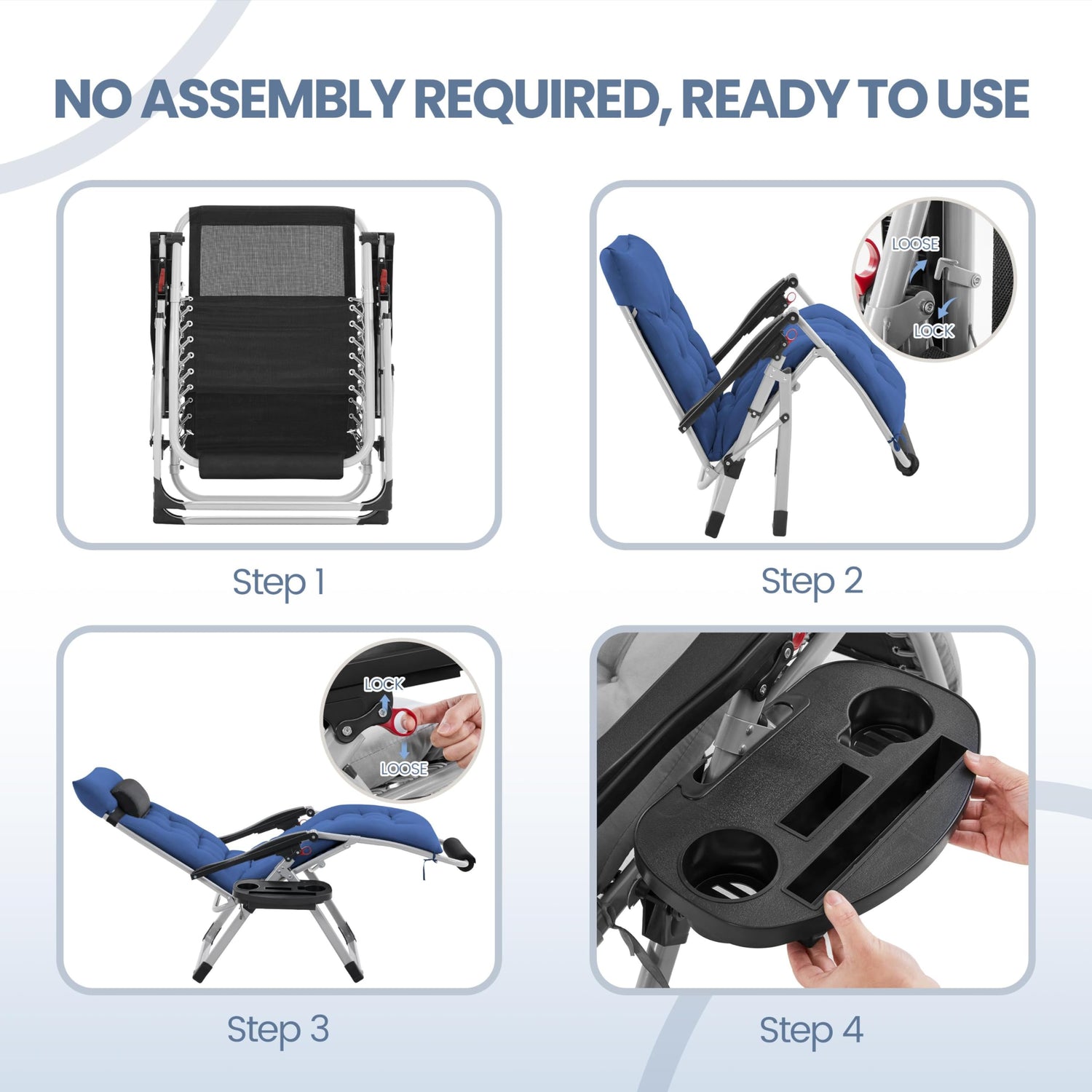 - Specifications: Color: Navy Blue; Quantity: 2; Materials: Painted Steel, 550g Texteline; Dimension: Unfolded: zero gravity: 62″ L × 26″ W × 31″ H; folded: 36″ L × 26″ W × 6.5″ Thickness; Seat:34.4″ Depth × 26″ Width; Max Weight Capacity (ea.): 400 lb