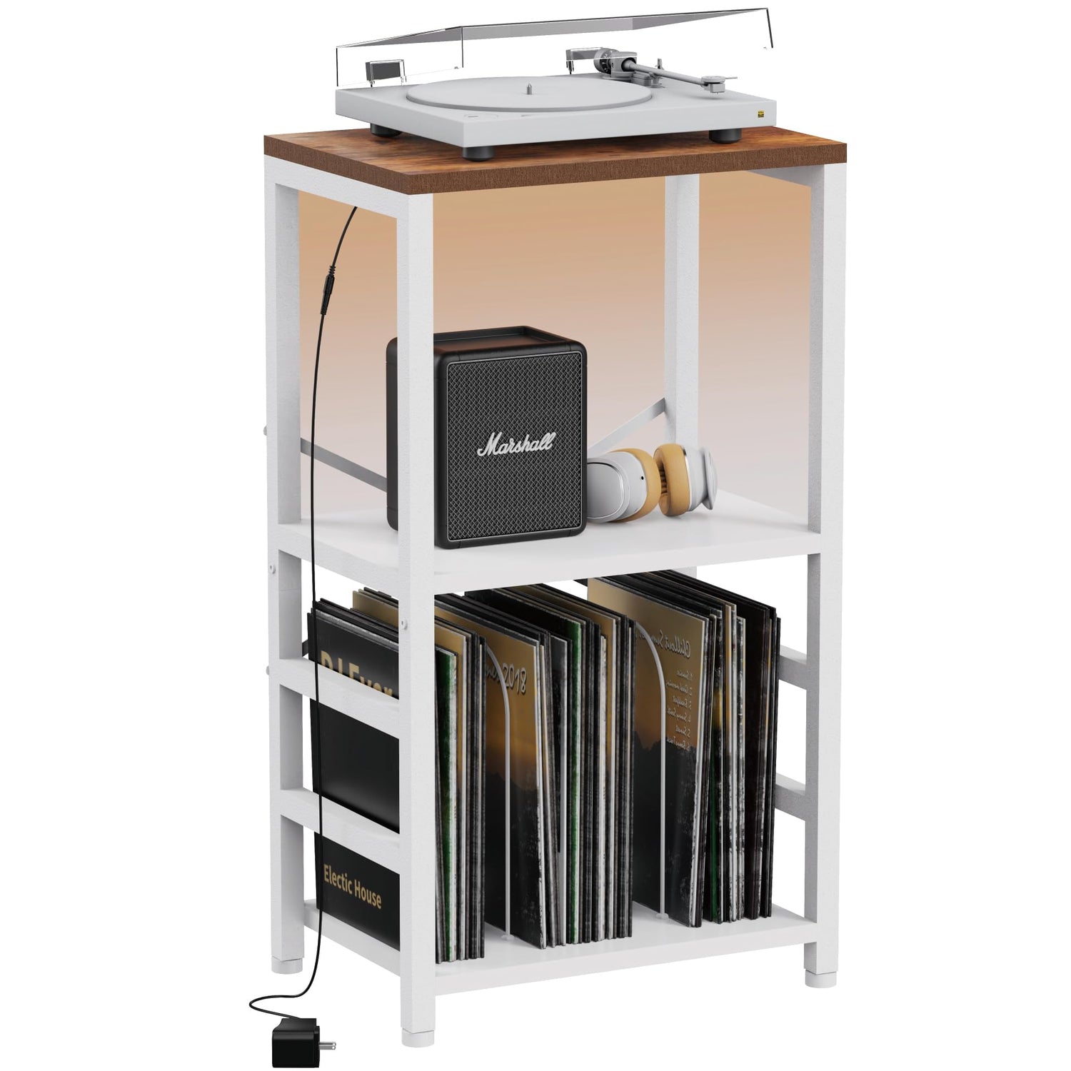 YAKANJ End Table with LED Light,Record Player Stand with Albums Storage,Vinyl Records Storage,Turntable Stand Side Table for Music Room Studio Living Room Bedroom-White