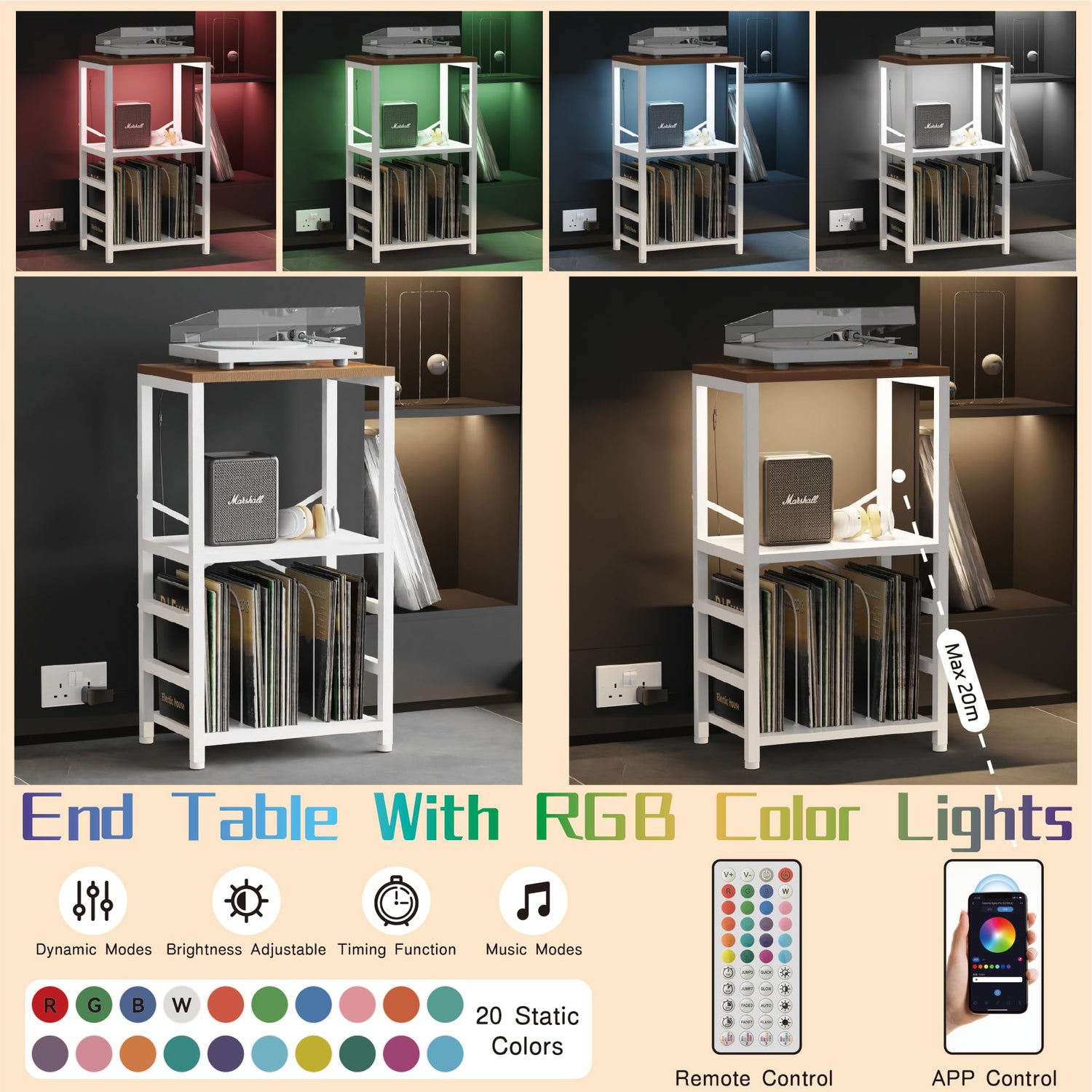 - End Table with LED Light:This is a record player stand but can work as any type of end table as well.it is perfect size for a small space,elevate your space with our end table's 20 RGB LED colors,along with dynamic modes,brightness adjustable,timing function,music modes,customize the ambiance with the remote control or App control.