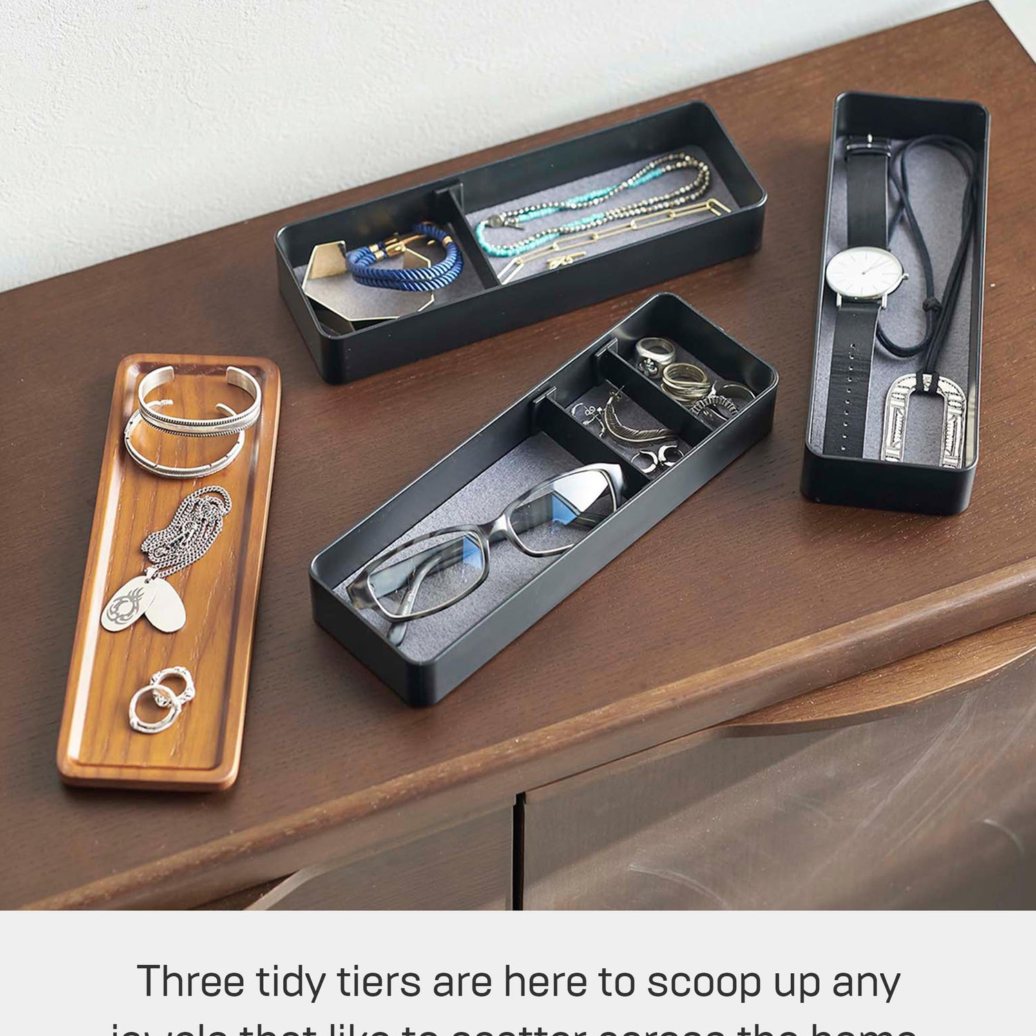 - [A beautiful accessory case that fits into your homes slim spaces] Three storage tiers as well as a natural wooden tray are packed into this deceptively small organizer.