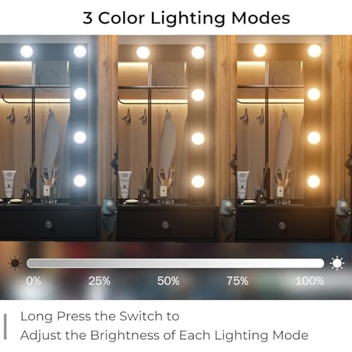 - 3 Lighting Modes & Brightness Adjustable: The vanity desk is equipped with an HD mirror and 11 bright Hollywood plastic bulbs, provides 3 color modes (warm/natural/cool) and adjustable brightness, this makeup vanity can meet all your different needs, perfect for home makeup, salon, and live broadcast., so you can experience the star-like makeup treatment.
