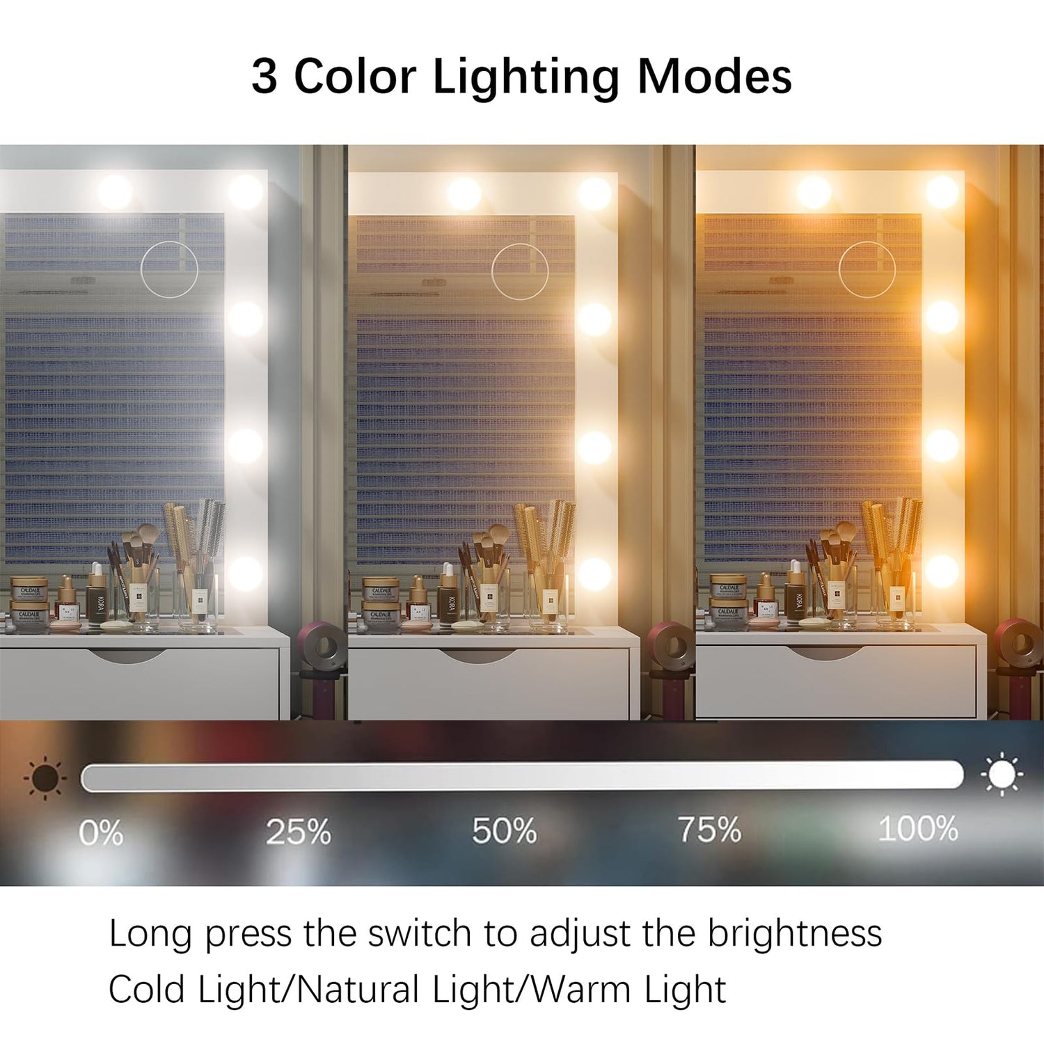 - 3 Color Modes: Elevate your beauty routine with our luxurious Hollywood-style makeup vanity, designed for both functionality and elegance. The 13 LED bulbs with 3 color modes (warm/natural/cool) and adjustable brightness provide flawless lighting for makeup application, live streaming, or salon-style glam. No more guessing under poor lighting—achieve perfect, camera-ready looks every time!