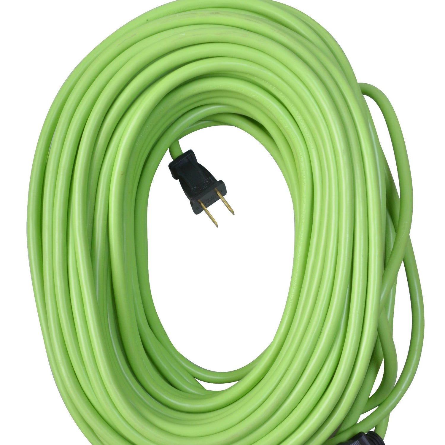 Details: Yard Master 9940010 120-Foot Outdoor Garden Extension Cord; Lime Green. 120-foot outdoor extension cord is super flexible and light weight; for less tangles when using. A 16/2 cord means the wire thickness is 16-gauge; and each plug has 2-prongs. 10A rating at 125V; 16/2-gauge; SJTW(rated weatherproof). Commonly used for appliances; electric grills; decorative lighting; holiday lighting; and outdoor applications. Jacket resists moisture; chemicals; oil; abrasion and prolonged exposure to sunlight. Molded plugs and Heavy-duty strain relief protects electrical connections resulting in longer cord life. Yard Master (TM ) is a registered trademark of Coleman Cable Inc.
