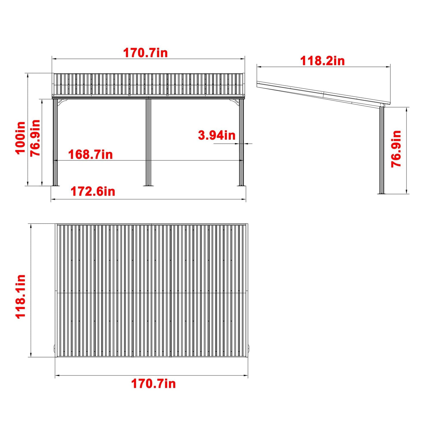 - [DIMENSIONS] Overall size: 170.7"W x 118.2"D x 100"H. Interior size of gazebo: 168.7"W x 118.1"D. Please make sure that the location allows installation before purchasing. Note that this product will be shipped in 3 boxes, which might not arrive at the same time.