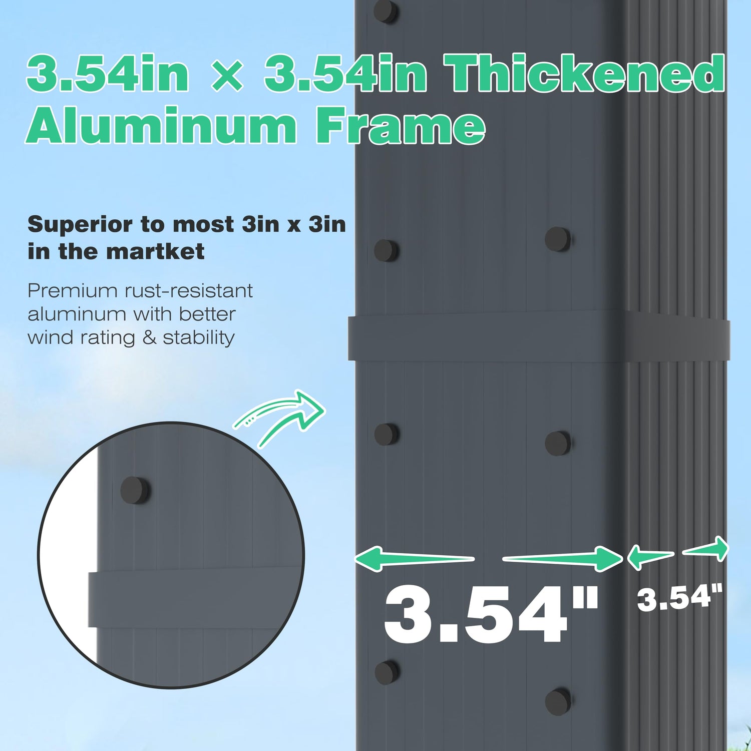- [UPGRADED THICKENING ALUMINUM FRAME] Sturdy frame structure and premium rust-resistant aluminum which help the canopy have a long service life. Resist strong wind and rainstorm.