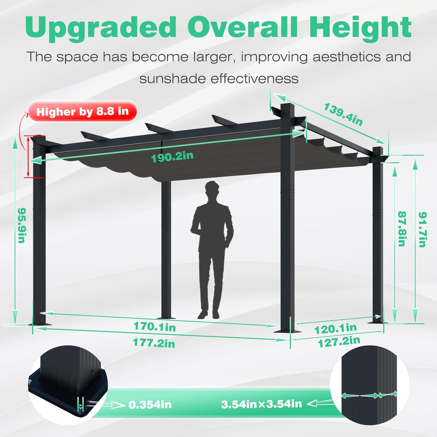 - [IMPROVED OVERALL HEIGHT] The space of the pergola has be upgraded, providing more area for your outdoor activities. You can organize parties or barbecues here, etc.