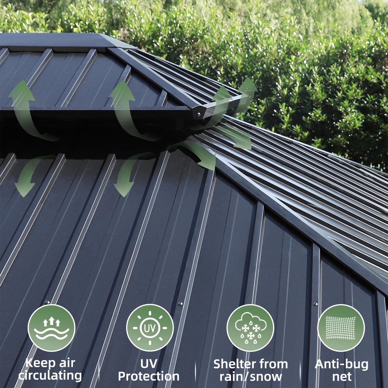 - [DOUBLE ROOF GAZEBO] This 12x14 ft gazebo features double heavy duty galvanized steel roofs which is water-resistant and blocks UV rays, keeping your outdoor time cool and comfortable. The roof is designed with top vents for optimal air circulation and comfort. The sturdy aluminum supportive frame is rust-resistant and makes the gazebo sturdy for long-term use.
