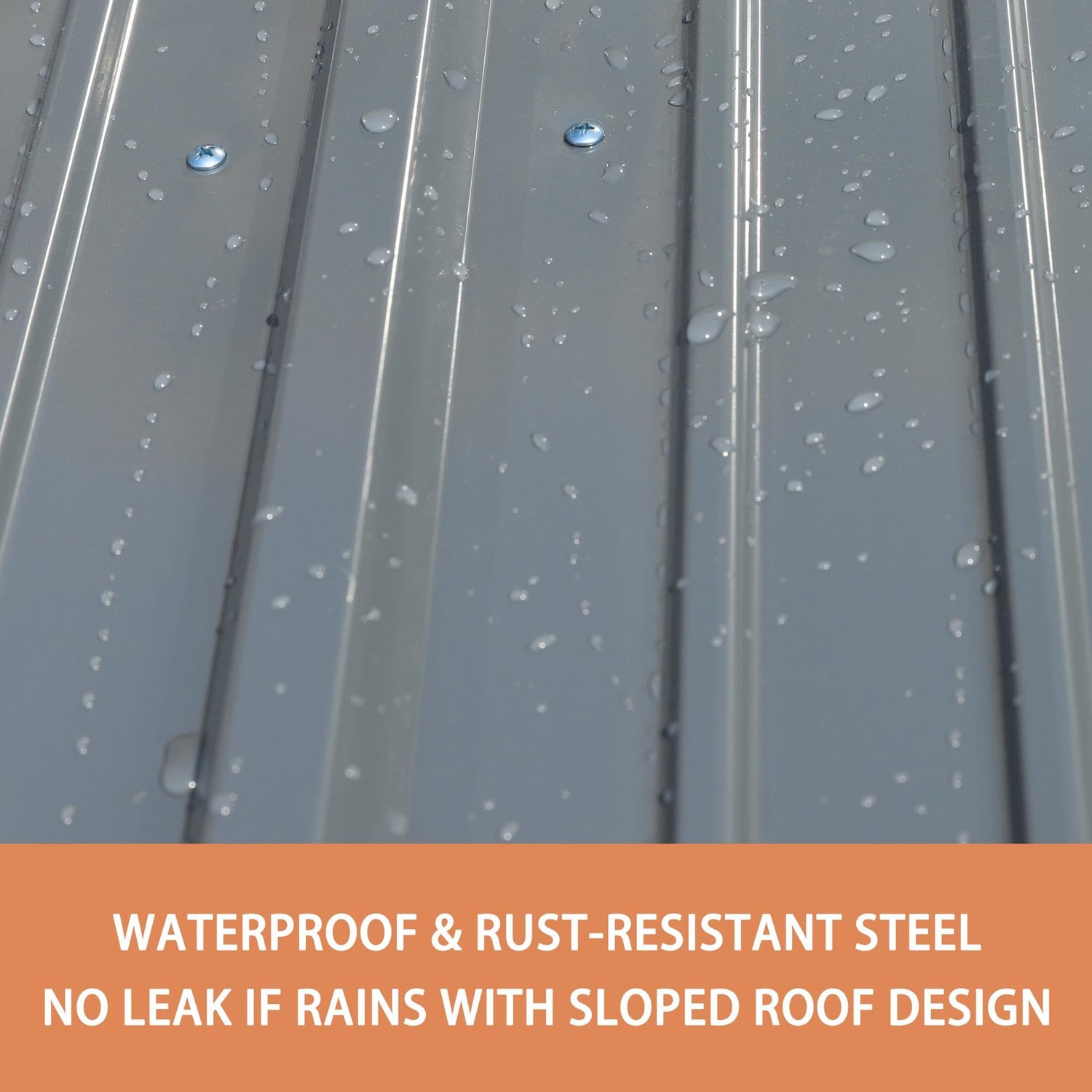 - [WATERPROOF SLOPED ROOF & 4 VENTS] Our outside storage shed features sloped roof design, so you don't have to worry about any damage caused by rain or snow. This sloping shed with waterproof and rust-resistant steel roof will protect your belongings from outside leak and keeping them dry inside. The ventilation openings also can provide the items inside with better airflow.